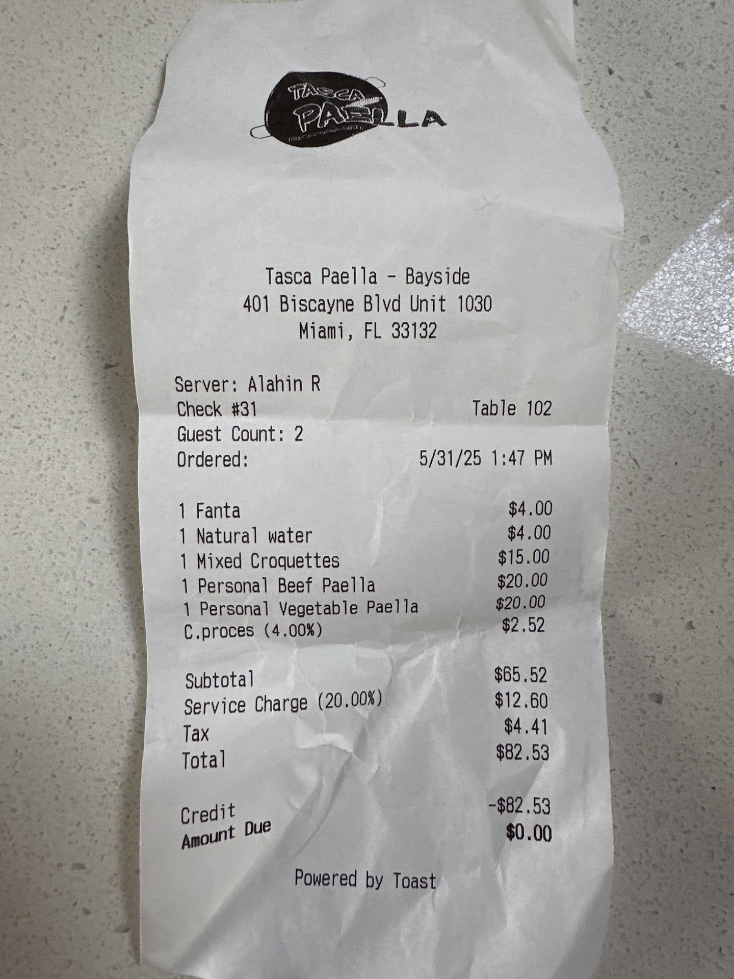 Read moreTerrible service. You have to ask for water separately and they only bring it in plastic bottles, they say they donât have tap water. Moreover, I had to ask for a glass separately. Nobody understands English. Three waitresses came up to me and asked questions until one of them realized that I was asking for a glass for the water they brought me. Water is brought along with cocktails, which means you will wait 15 minutes until they bring you everything together. They donât bring you a check, they just name the amount and show it on your mobile phone. When we asked to see what the amount consisted of and to bring us a paper receipt, the waitress left, then returned and said that there were no paper receipts. We asked to see it on the phone, it turned out that paella for one was written as paella for two, that is, they tried to charge double the price. And on top of all this, of course, a 20% tip is already included in the bill. But when you pay, an offer to pay the tip again will pop up on their mobile phone. That is, if you are inattentive, they will slip something into your bill and you will pay the tip twice. Be...