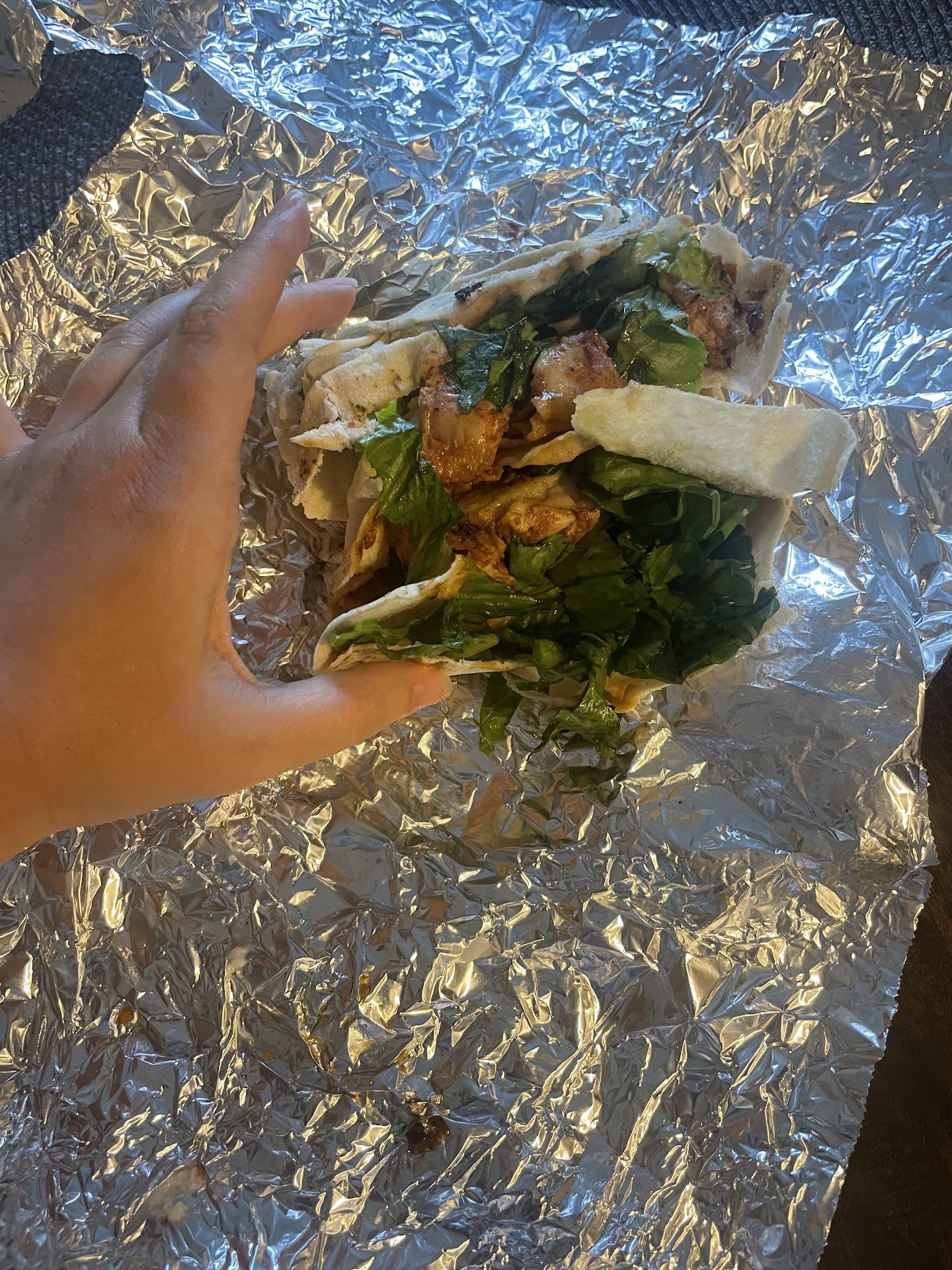 We ordered two small chicken shawarmas. While we were waiting, we were shocked to hear excessive cursing coming from inside the truck—definitely our first red flag. When we finally got our order and arrived home, we opened the bag only to find a sloppy taco and a poorly wrapped burrito! We had ordered two of the same chicken shawarmas, so this was completely baffling.