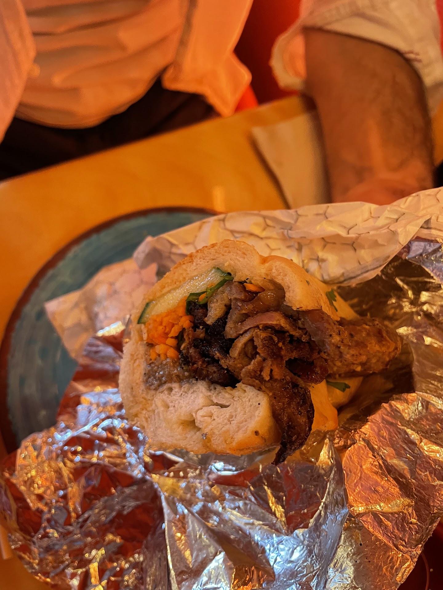 The Imperial Spring Rolls showed up first. They were delicious, hot and fresh on the plate. Then the BBQ Pork/Sausage Noodles arrived. The Grandma's broth was bland and not very hot, more like lukewarm. Edible, but awesome. Then the Beef Bahn Mi was presented. The manager brought it to the table and apologized for the delay, as it was sitting on the counter for a while (as the server played on her phone). I'd say maybe 1/3 of the beef on the sandwich was inedible due to poor quality, gristle, etc. Also, the bahn mi had paté on it. Too much in fact, especially when we picked off the inedible beef pieces. It was basically a "cat food" sandwich.