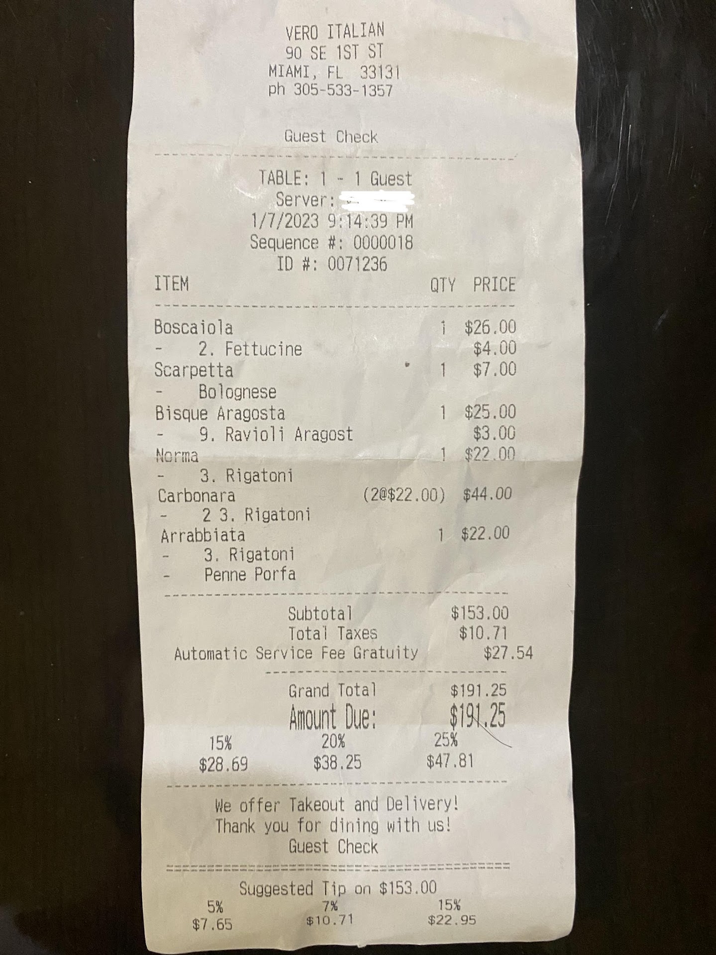 My partner and I came to Vero on a Saturday night at 8 PM and it was slightly busy (about 7 or 8 tables). We had a reservation confirmed a week in advance. When we arrived, one couple was waiting with us at the restaurant entry and no one greeted us for about 10 minutes. When we finally were greeted by owner Paula, she said they were too busy due to the Miami Marathon and couldn't accommodate the reservation (despite having at least 2 or 3 tables open). After mentioning once again that we had a reservation, she then sat us at a dirty table which remained dirty for the duration of the meal.