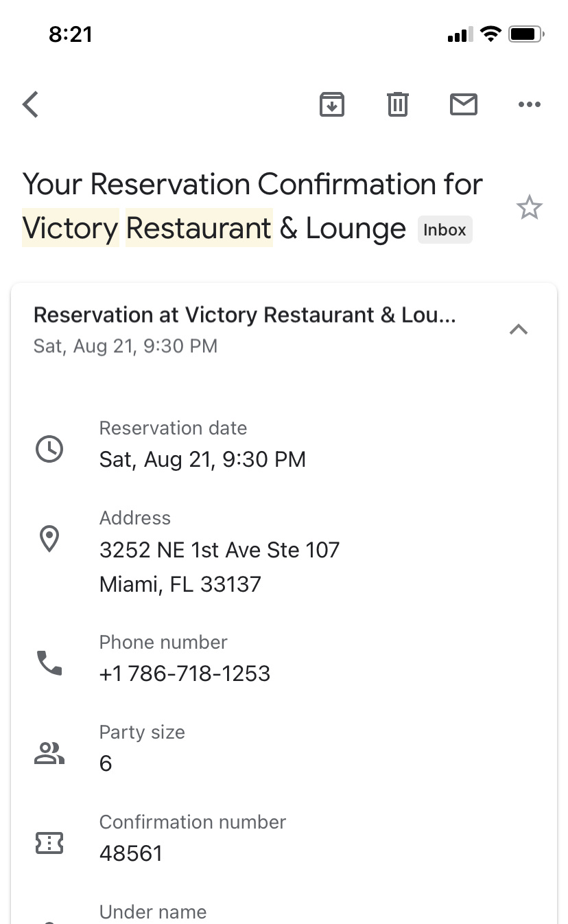 Reservation: January 31st 2022 Monday night At 9:30 PM