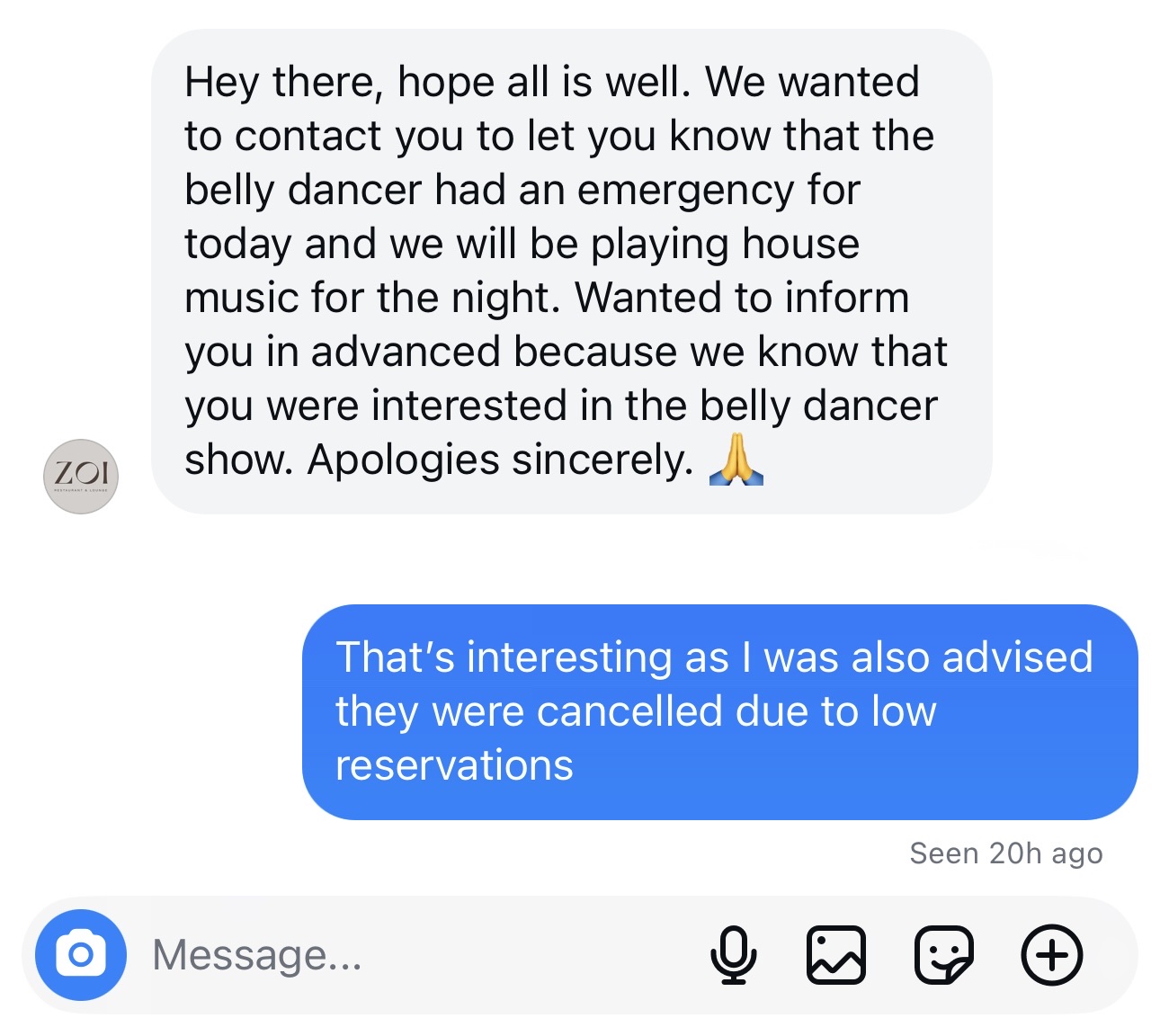 Read moreMy experience at Zoi was subpar. I went to this restaurant for a birthday celebration and once I arrived I was escorted to my table. The ambience was lovely but I had asked my server about the water we were drinking. I noticed it was bottled and wanted to ask if we could switch to tap water since we did not want to pay for still water. When I raised my concern to the server I asked him what the difference was between the bottled and the tap water and he told me that "the tap water comes from the sink" with a sour attitude. I asked him if we could switch to tap since we didn't want to pay for several bottles of water for our 10-person party. After this moment our servers attitude completely changed and he was very cold with us. He brought us the tap water we requested and it had debris in it. We told him there was debris in the water and he took the water away but did not refill our glasses for the rest of the stay. We ordered one round of alcoholic drinks and one of the alcoholic drinks we ordered also had debris in it. We wanted to order more rounds of drinks but our server only came back to our table to get our food order (we were not ready for the next round) and ask if the food came out okay (we had to get his attention before he left to order one more round at that point). The food was expensive for mediocre quality. It was fine but it was not worth the prices and definitely not worth feeling like our server wanted nothing to do with us because we switched our water option to the free one. After we finished our food he came with the drinks but didn't even serve them to us. Another nicer young woman served us the drinks. At another point an entirely different woman helped refill our water and buss out table. Our server had left us alone for at least 40 minutes straight. Our entire party had to continuously extend their paid parking meters in the meantime. We had wanted to get dessert to celebrate my friends birthday but we had already been waiting so long that it was not worth it to order dessert, wait for it, and then wait 40 minutes longer after we are done to pay our bills. We wanted to separate our bills and he did not even give us a copy of our checks or show us the itemized receipt. We were simply shown the screen to sign and tip extra if we wanted to. We were never given the servers name because he basically refused to speak to us and any interaction we had was extremely dry and cold anytime he was required to interact with us and gave the absolute bare minimum service he could. Terrible experience. I am never recommending this restaurant to anyone else I meet. The atmosphere and the performances were the highlights of my visit but I come to a restaurant to be treated kindly by the staff and eat delicious food and got neither. Extremely...