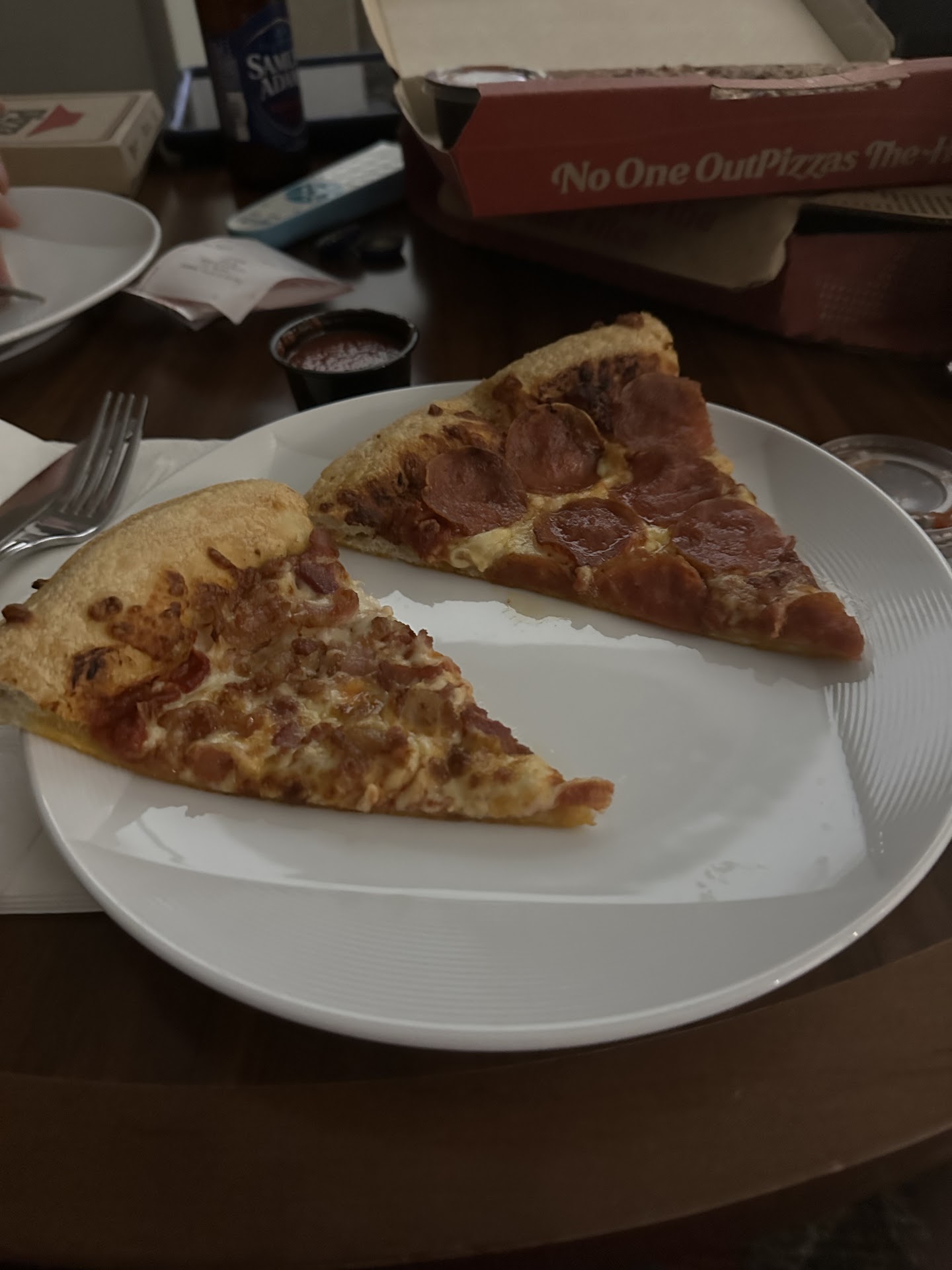 That behind me we ordered from Pizza Hut. We ordered two pizzas and breadsticks. The pizza was excellent and the soda I ordered sax nice and cold. The only thing that was not very good was that the breadsticks were a little overdone.
