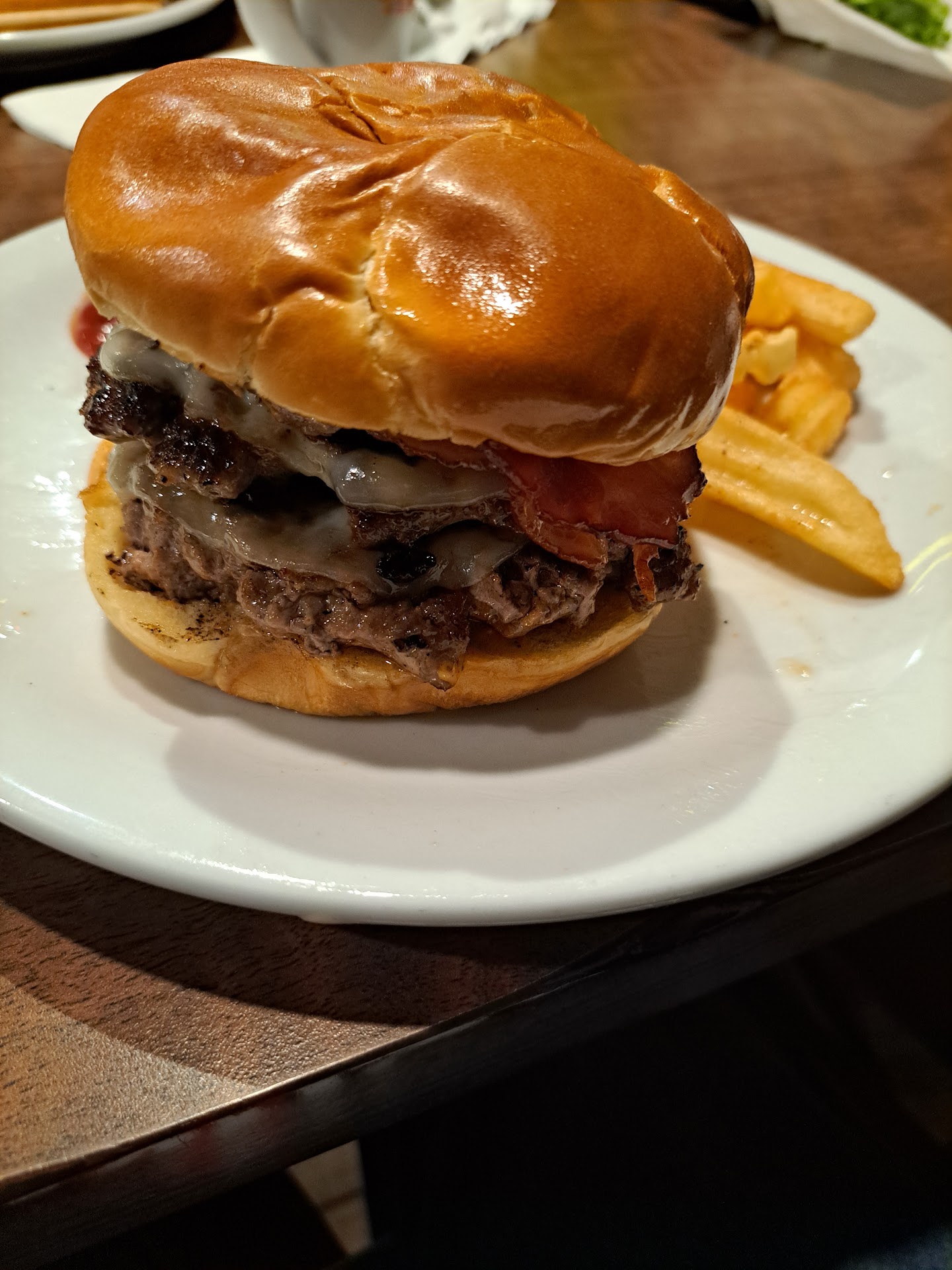 I ordered the Bettlejuicy burger with fries and a coke. My wife had the Bourbon Bacon burger with a side of onion rings along with a coffee and a water. The cook that night cooked everything perfectly. I think his name might be Nathan, but I'm not positive about that. My burger had 3 thick quarter pound patties, and all 3 were cooked just the way I like them. Not well done, not undercooked, but just right and very juicy. It was the most filling and one of the tastiest burgers I've ever had. I highly recommend it to anyone as it's almost certainly a limited time sandwich to tie in with the Beetlejuice movie. Do yourself a favor and try this burger. You won't be disappointed.