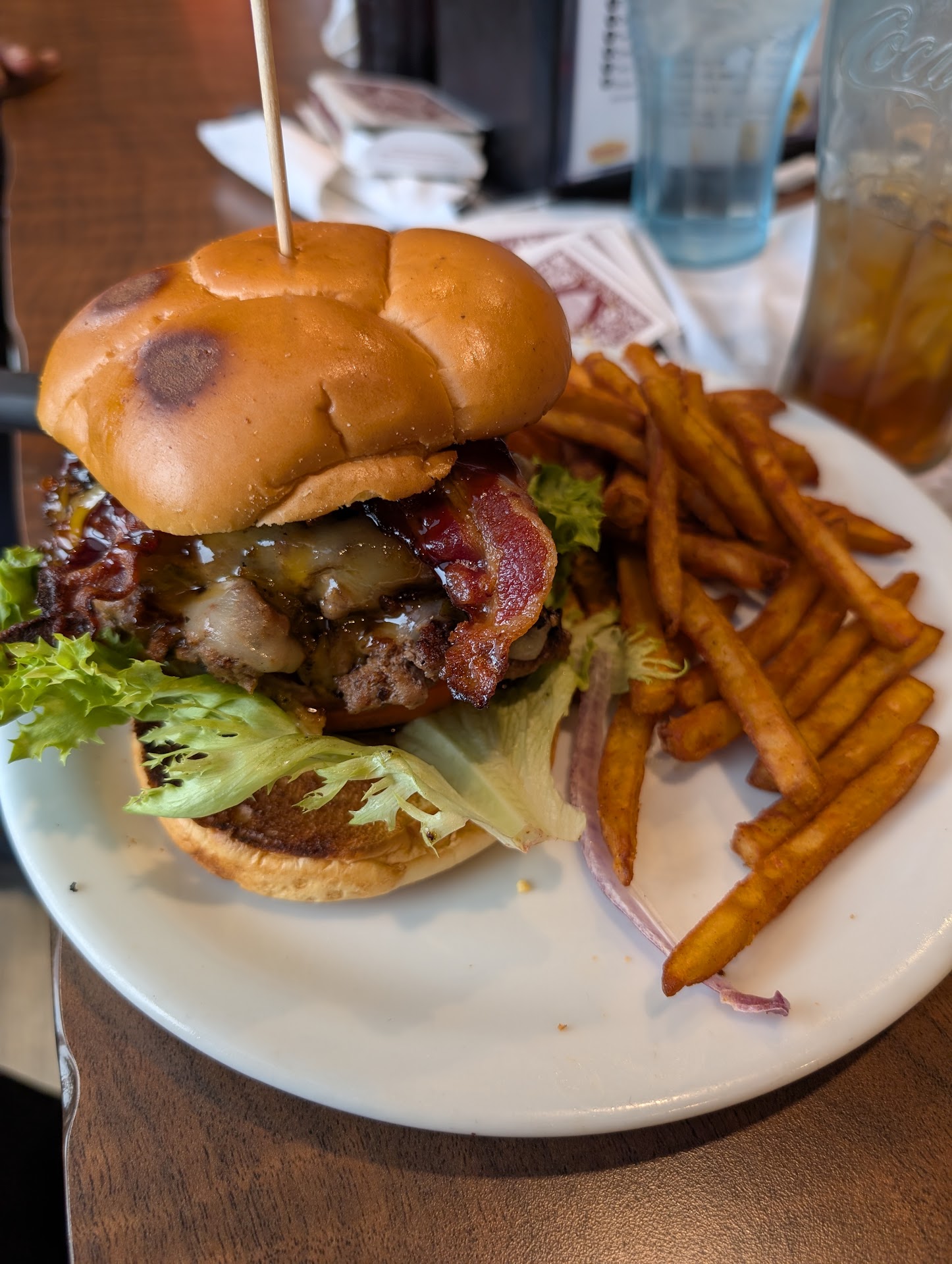 Read moreI'm giving a higher rating due to previous visits, but our experience this evening was not as good in comparison. I suggest going for breakfast as staff seems to be on top of everything, food is served quickly, and is prepared better. We love making the trip for breakfast, and have never had a bad visit during those mornings when one might expect a wait or hurried preparation. However, on a slow, snowy week night with only a few other tables of people willing to brave a potential winter storm, it was lackluster at best. Our server was warm and friendly, but the first cup of coffee (yes we drink it with dinner when the mood strikes) was lukewarm and, well, not very fresh. I get it, nobody was drinking the Joe at that time and why brew more before using what's already there. But then we drank our lukewarm coffee quickly enough, hoping for fresh refills, only to realize our server would not return until the food was done. And that wait was way too long for only having three other tables with guests. My burger was delicious- only it wasn't really a burger, but pieces of what was once a burger patty carefully pieced together until it was picked up. Then they started falling from every side of the bun. I waited too long for that mess. It was cooked properly, they weren't stingy on the toppings, but it was disappointing to have it fall apart wth every bite. My kids were especially impatient, as kids tend to be at restaurants, and if our server had made an appearance earlier I would have suggested she bring my son's goldfish and my fruit side for them to munch while we wait. As a long time server, this is an easy tactic when you see kids getting antsy, and the parents ALWAYS appreciate the help. As I said, food was good. But service could have been more attentive and quicker; the manager did do a round to check on everyone, but it was right after we'd ordered so we had barely been there long enough to have any complaints. I would visit for dinner again, but at this point it seems peak hours during a weekend would be a better choice as a fuller staff might guarantee a...