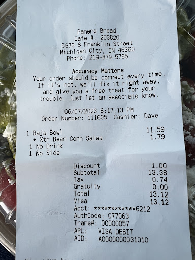 Previous Review: Dangerous. Report workers to health department. Terrible experience. 1.) Waited at counter 5+ minutes, then had to find worker. 2.) Worker balanced mop handle near woman’s room bathroom door, which fell on and tripped patron, completely blocking bathroom opening. Had to step over it to leave bathroom. Worker went behind counter to food prep area and donned fresh gloves, but DID NOT FIRST WASH HANDS after cleaning bathroom [upon returning to the prep line]before making food! 3.) Male worker on duty was wearing gloves while making food, but using his personal cellphone simultaneously. Other prep worker, not worker who cleaned the bathroom, told him to “put it away.” He put the phone in his pants pocket and immediately stuck his same hand in the arugula … without first changing gloves. I asked that he change gloves and remake my sandwich, but as he had already contaminated all the arugula and other lettuce and vegetables by using a non-sterile cellphone with the same gloves he was sticking in the food products, I could only safely eat a fully cooked item (read killed bacteria), so my sandwich was missing the arugula. The spoons he was using to top the onions, garlic aioli, were also touched with his non-sanitary gloves and repeatedly stores in the toppings. He literally contaminated every product touched. Not sure which person squished my new sandwich, but it seemed like either they just don’t care about the quality of the food or it was retaliatory. Either way, I am furious. Two other patrons, unknown to me, but one was the person the mop fell on, were also angry. This is absolutely inexcusable. SO MANY HEALTH CODE VIOLATIONS! Someone is going to get sick! These people were obviously trained, so should be written up by the shift manager. (I believe this is the person who told him to “put it [cellphone] away.”) These people are directly responsible for the health and welfare of the public eating at this Panera location. That is a very serious responsibility. The public must be able to trust the quality and safety of Panera’s products.Every food item either worker touched is contaminated and possibly dangerous to the public health. The food must be tossed. The restaurant must be completely sanitized and the managers and staff retrained, before they hurt someone. Do not risk eating here. Will update review if Panera contacts me to tell me how they plan to correct these issues with the Michigan City, Franklin...