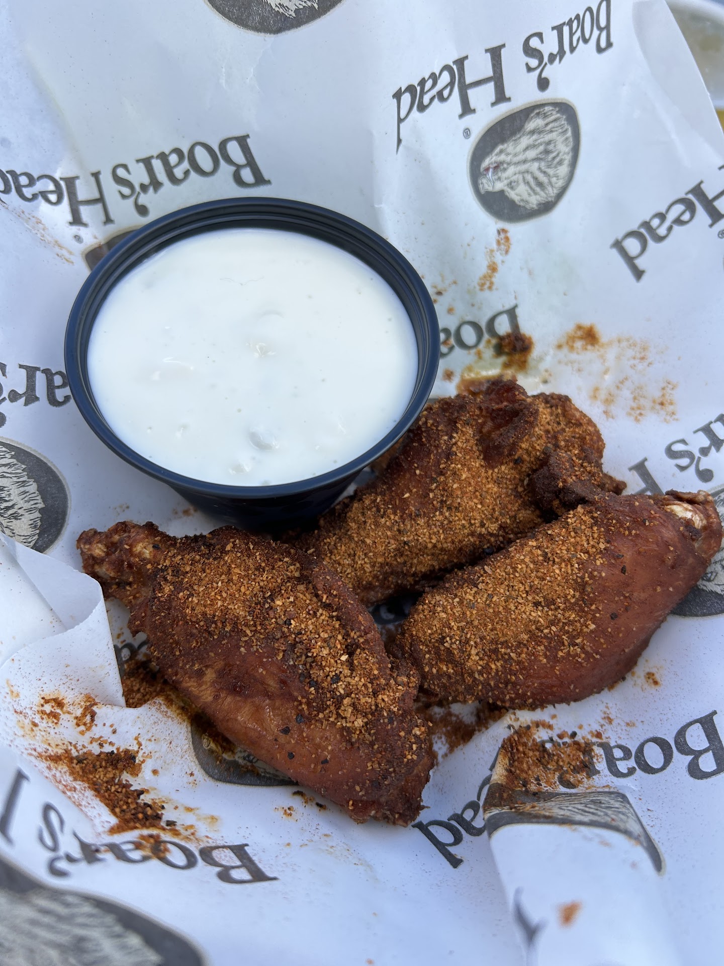 Once we were outside after several minutes the bartenders took our initial order. Pretzel with beer cheese, kids meals, and their “famous” Jamaican wings. The pretzel and beer cheese was top tier! 10/10! Kids meals were basic fried chicken tenders and shrimp with fresh cut fry’s. (Unfortunately the fries were unsalted and not crispy. Wings were basic bar wings. If your going to put famous on the menu they gotta be better the basic bar wings.