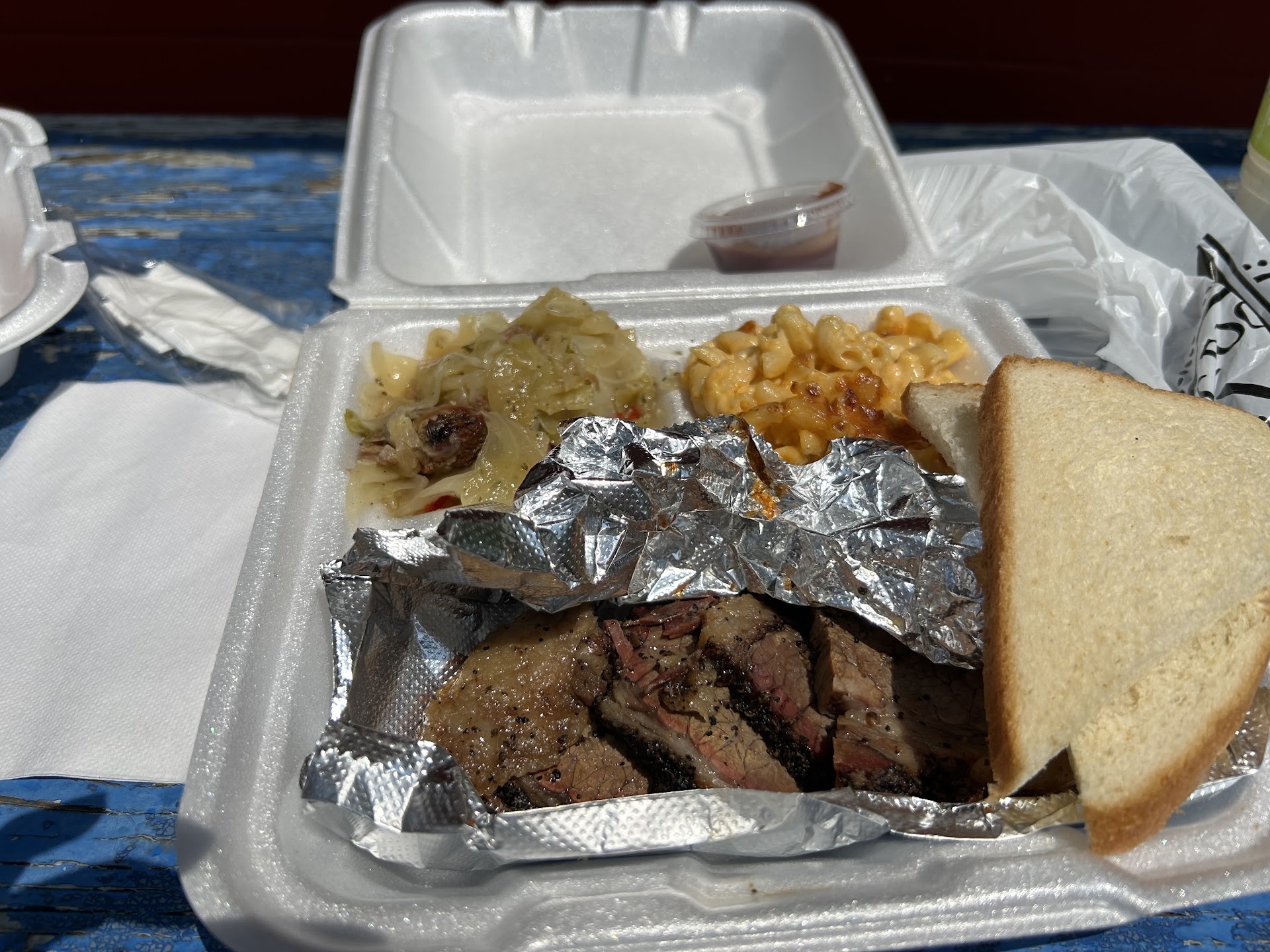 We also shared the brisket dinner and chose Mac and cheese and the cabbage as the sides. Brisket was out of this world tender, nice hit of smoke, bbq sauce had a good kick to it. I could eat that Mac and cheese every day for the rest of my life, it was so good! And the cabbage had good seasonings and nice big hunks of pork. For $14, it was a steal.