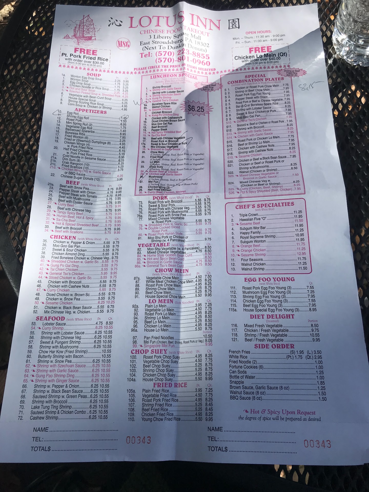 Ā Ā Ā Read moreMy wife, mom and I love the food here! Everyone's Palate and expectations are different! The food is not oily like other places. We order at least 3 times a month. We get Mei fun shrimp, beef with broccoli various soups fried dumplings not to Doey. Today I decided to try the Vietnamese mai fun and was delicious and hot and sour soup VG! Many people that come from NY and I introduce them to Lotus Inn they love the food. For me it's my go to Chinese! It's only my opinion! You know what they say...
