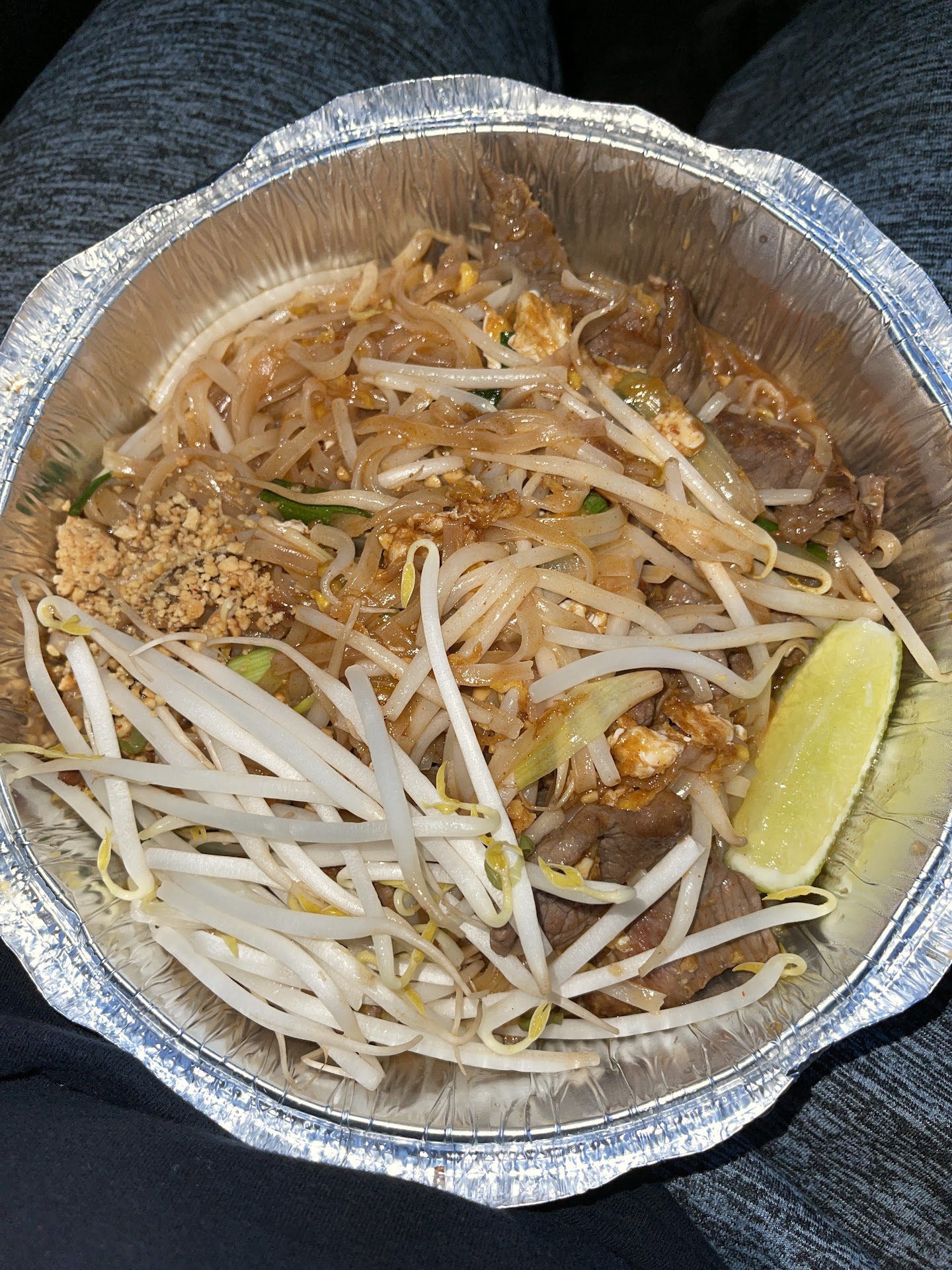 However the pad Thai really wasn't pad Thai at all. It was as if it was made with sweet and sour sauce. It was reddish with none of that complexity of flavor you want. And also no fish sauce taste. Which is why my husband who hates fish sauce managed to actually eat it. I however wanted the flavors I was craving. The bean sprouts also appeared to be quite past their prime (the leaves were brown). I knew how it would be though based on there being no limes available. They served the pad Thai with lemon slices and it was just not right. The noodles were fine. But it wasn't pad Thai. Overall it filled us up but it...