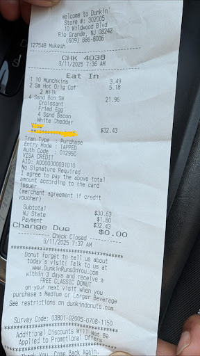 so sad. i’m born and raised in town so i’ve been raving about this dunkin over the north cape may one for years and found that they WERE far more superior in every category, whether it was the drinks tasting the same each time, the selection of foods being available, and the cleanliness, but today’s order will make me NEVER STEP FOOT in the Rio grande location ever again. I will preface and say that it is Labor Day so it was insanely busy. I waited 30 minutes for my mobile order which even so is super understandable considering it’s a holiday, But they did not have any munchkins at all after I paid for them and they told me I had to contact someone online for a refund, my coffee had black hard pieces of something in it. I’m hoping they were just coffee grounds, but they were very hard and lined the Bottom of my cup. And lastly, my breakfast sandwich had a long blonde hair in it. I didn’t even take a bite yet. I just opened it from the rapper and saw the hair. Absolutely disgusting will not be...