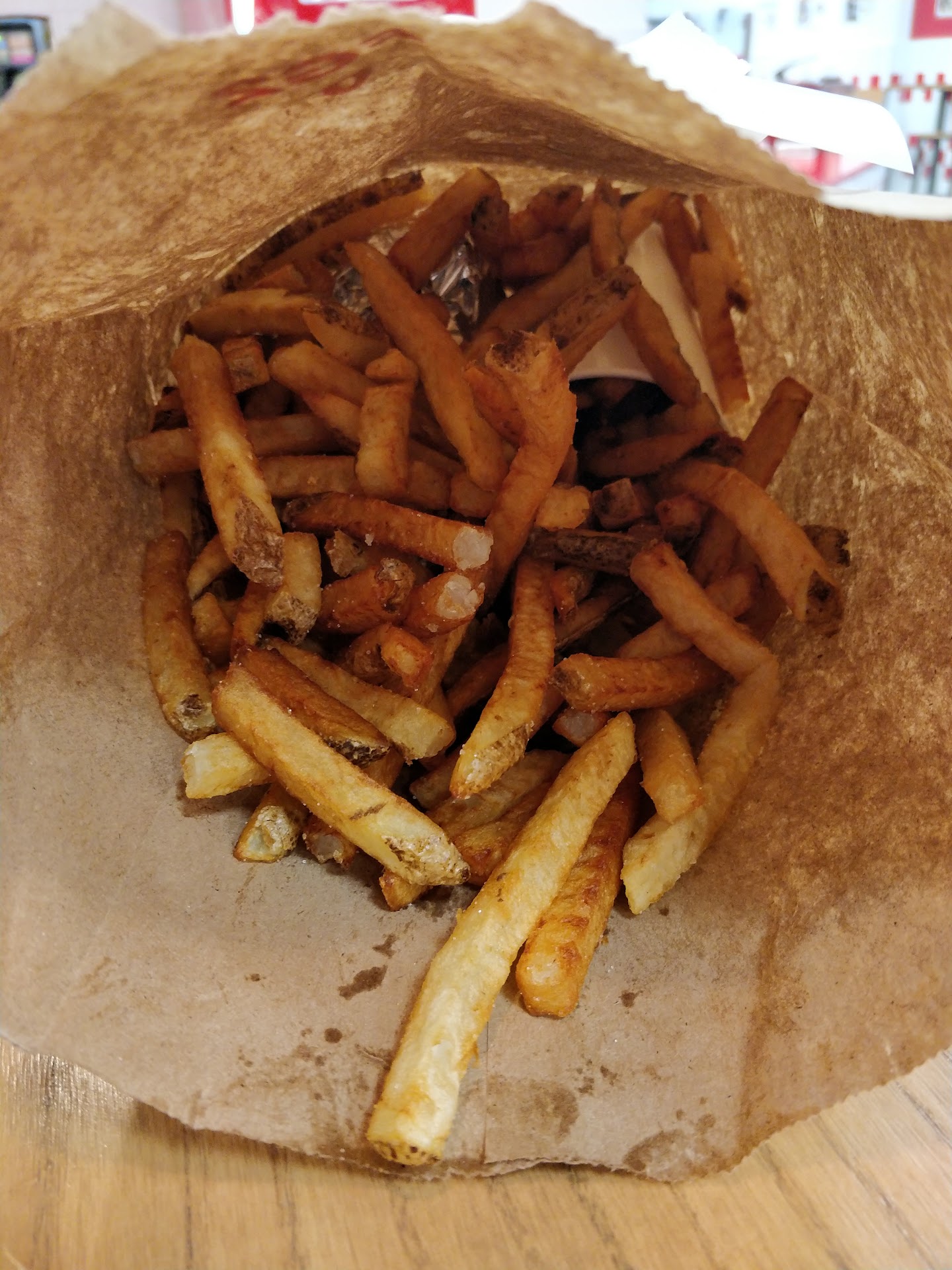 Original review: Great place to stop and eat, food is delicious. Portions are HUGE, so don't order a large fry unless you plan on feeding your 4+ family. A medium fry will fill up your cup and the bottom of your bag (two cups full). It takes about the same time if you pick up an online order as it does to order at the register since they make the fries one you pick up. (about a five minute wait). Other than that, it's a nice (yet unhealthy) place to...