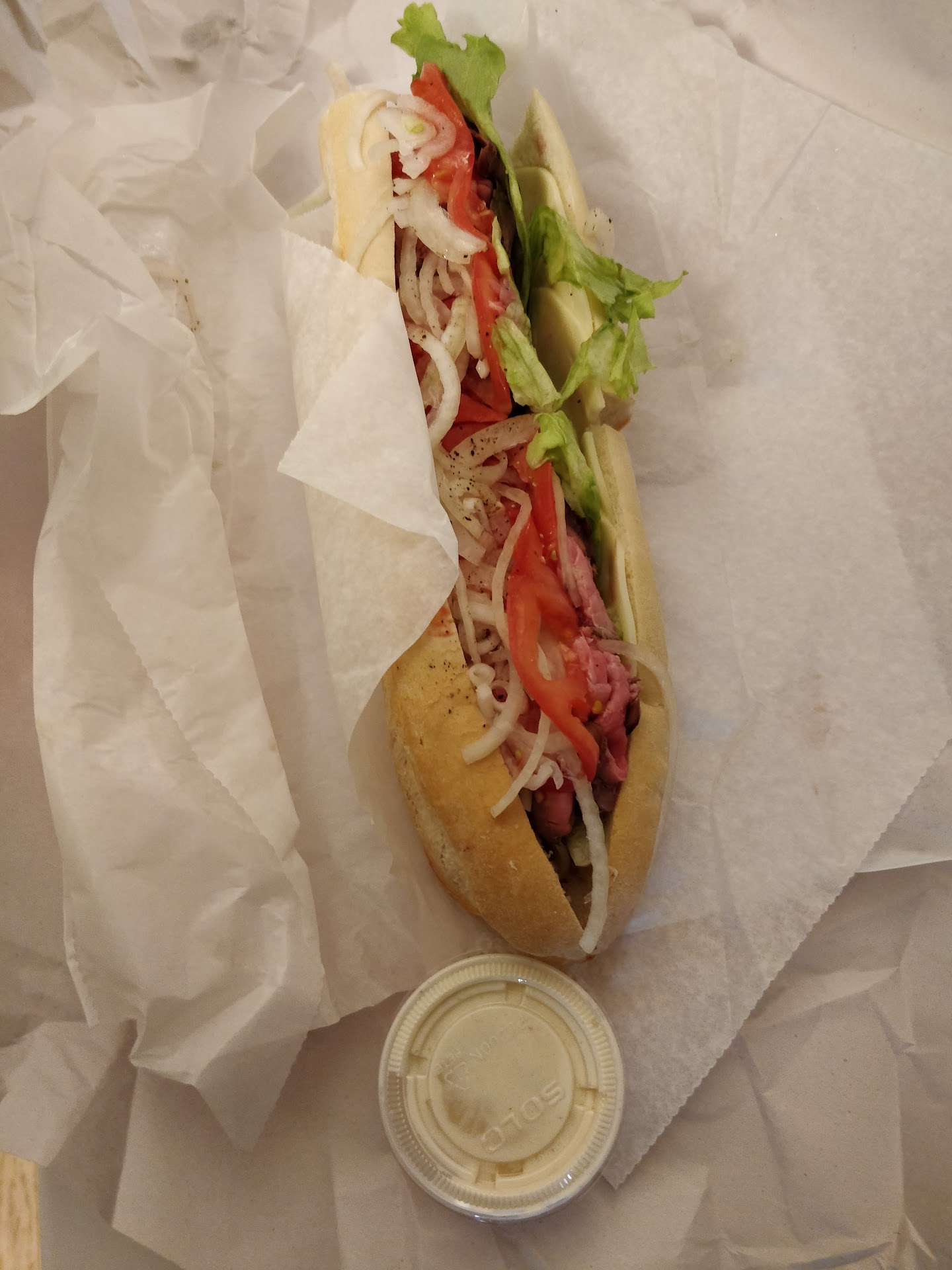 The sub itself is lopsided, w all the meat and cheese on one side and the LTO/etc wedged into the other side. Given how sense and chewy the bread was, this resulted in everything not meat and cheese being pushed further out and back w each bite. If you've had a legit Italian sub from Philly area, you know that the build is crucial to the bite.