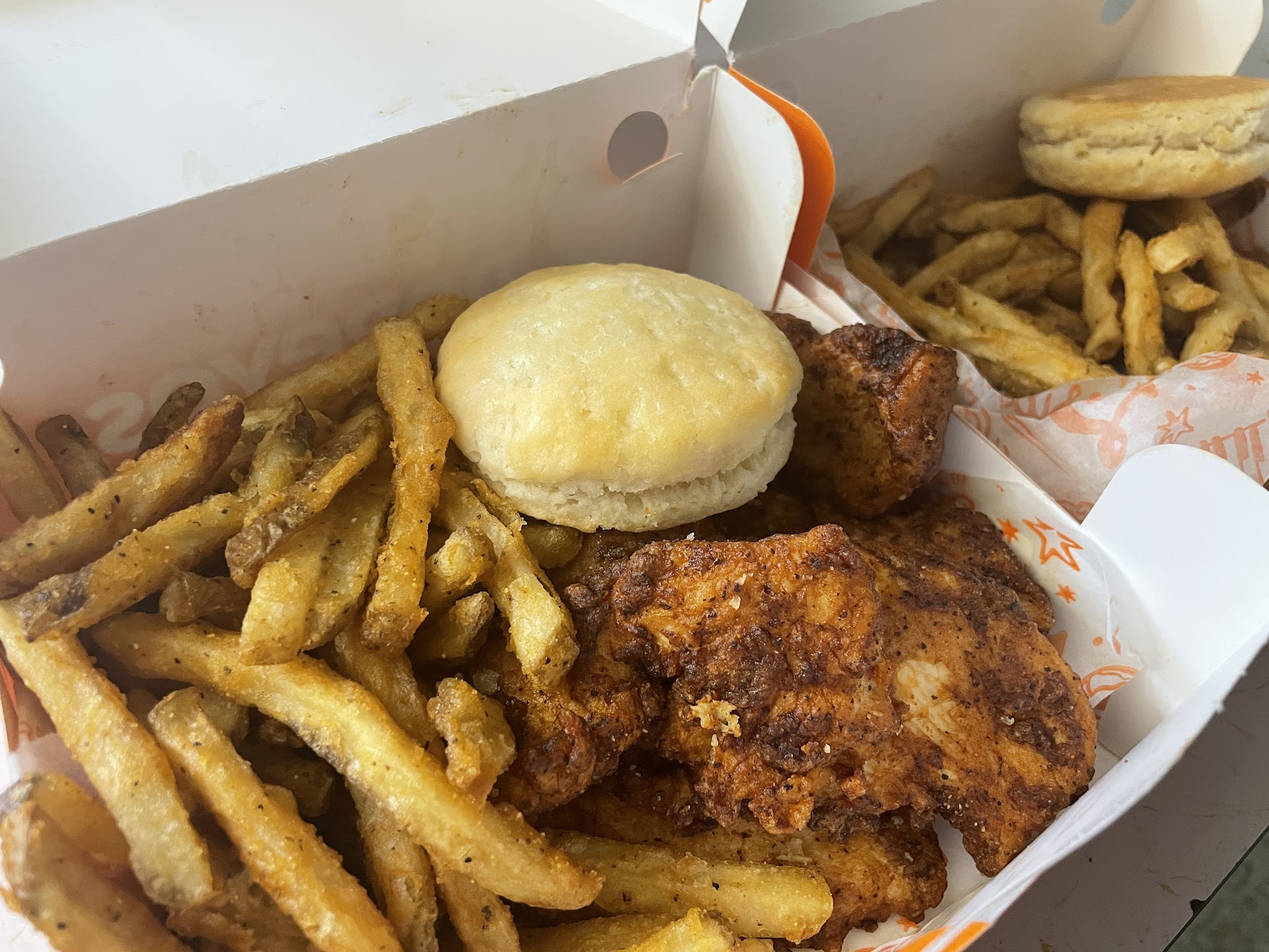 Onto the food, it was delicious! The blackened chicken was delicious and seasoned well, and the fries and biscuit I were told were tasty as well.