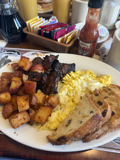 I ordered the steak tips cooked medium well with home fries, eggs, and raisin toast. The steak tips were cooked perfectly, tender inside with a nice char on the outside. The raisin toast was incredible with a light cinnamon sugar edge that made it stand out. Others at the table ordered omelets and French toast, and everyone said their meals were delicious. The portion sizes were generous, and every plate was finished.