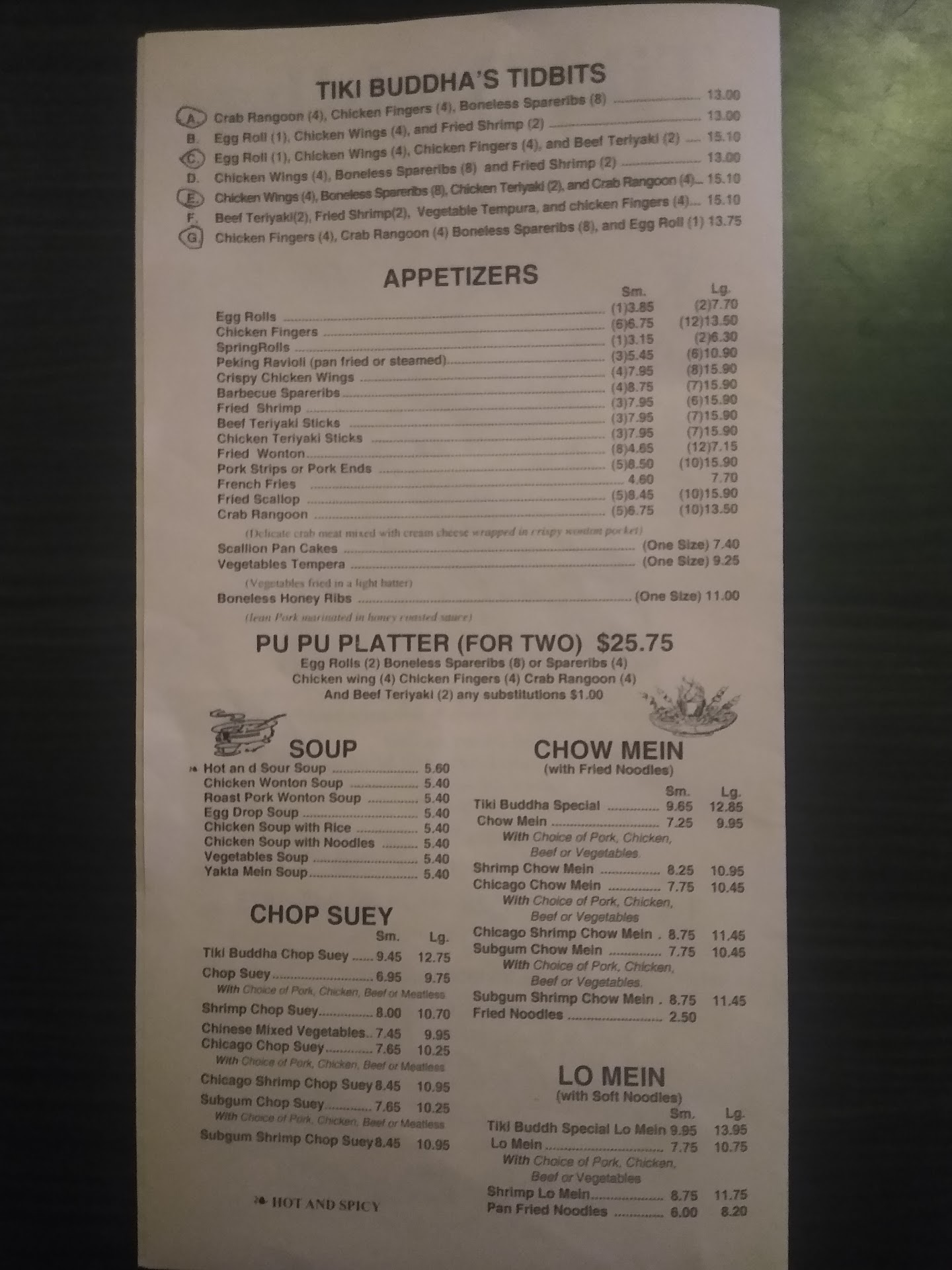 Read moreThe host legit said nothing. Looked at us. Walked to our table and put the menus on table in a pile and walked away. Then we walked to the table. The crab rangoons were hard as rock with very little filling compared to most places. The food really didn’t taste all good. My fiancé loves Chinese and gets it from a lot of places and even when I don’t think it is the best meal, she would still like the food, but at tiki Buddha she had to stop eating and told me it really doesn’t taste good at all and it is gross. We haven’t gone again since. I remember when I was younger they were good, but times change I guess 2 stars only because I remember when they were...