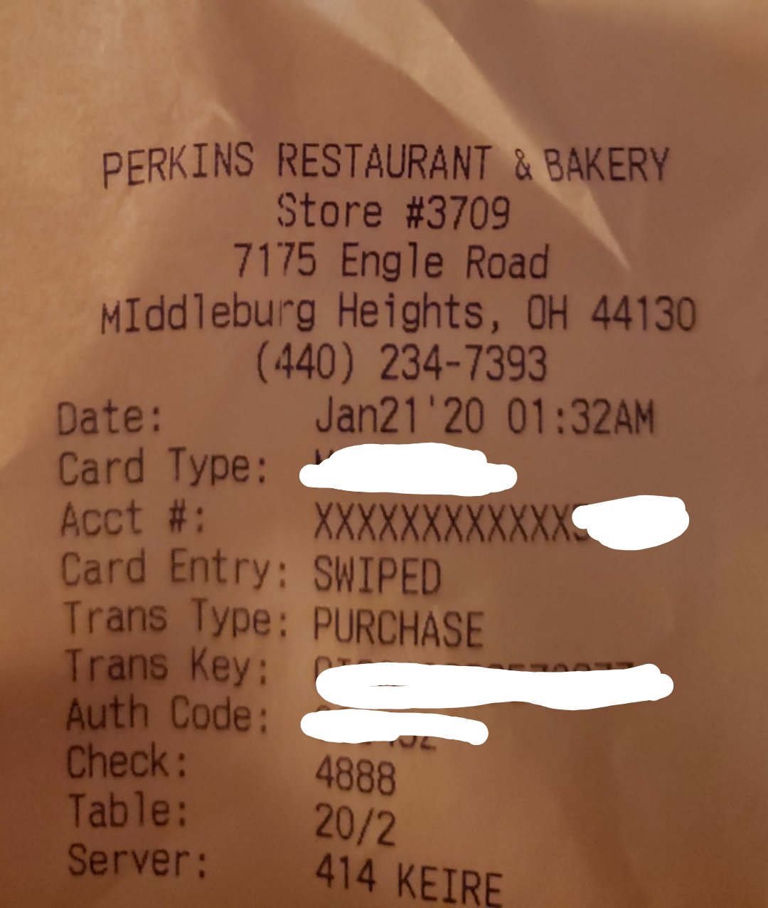 Wish I could give this place a better rating since it is one of my favorite restaurants since I was a kid but after the experience I had this evening I don't think I will ever be returning. Me and a couple of friends went to the casino we did pretty good so we've decided that we go to Perkins to celebrate. We walked in we were mildly greeted by a lady we sat down at a table we all ordered a water with lemon as we do at any place until we decide what we want to drink or eat or if we want a milkshake the lady seemed like she add an attitude about us ordering water not knowing we were ordering something else she then brought it back to the table asked if we needed a few minutes we said yes when she came back we ordered our food and we also ordered pop to drink we waited about 10 minutes still no pop when she came back to the table we reminded her that we had ordered it she went back and got it after that when the food came out I asked for scrambled eggs with cheese I got normal eggs no cheese thought to myself no need to complain she's probably having a long night... afterwards I noticed my bacon tasted a little weird... halfway through my meal I started to feel violently sick I went to the bathroom and got ill from the food while I was in the bathroom she came and asked if we wanted our checks the people I was with said no please hold off on the check as we are probly going to order pie she got aggravated and brought back the receipts and slap them on the table as if she wanted us to leave so when I finally came out of the bathroom I was told about this and then we just said screw it we will pay for our bill I walked up to her and told her that the food had made me sick and she literally just laughed and said OK .....as if like what did I want I wanted her to do about it I then said after I paid and tipped her please have somebody check the meat I don't want anybody else getting sick like I did and she said yeah I'll get right on that in a joking manner very disrespectful can't believe...