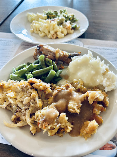 Stopped in here during a day of shopping, pouring rain all day and was really looking for some comfort food. The first thing that struck me was the cafeteria feel of this massive building. Sure, they have all the kitschy knickknacks, for sale in another area of the building, but still, cafeteria. Then the menu shows the big seller is the buffet $17.99 at least it was at 2PM and you could take your left overs with you at $7.99 @pound. Salad bar(standard), dessert bar( bare minimum) and main course. 2 types of chicken(fried & baked), chicken & noodles, standard side dishes, 2 types of gravy, meatloaf. That's about it. There were other menu items, of course, but price wise it just made sense to go with the buffet. I rarely take this option as I eat like a bird and cannot get past 1 plate but everything on the menu was priced about the same and I couldn't decide. It was OK but reminded me of being back in school. Mass produced food. Bland, no flavor, hospital food. My companion hated everything except maybe the banana pudding and the rolls. The nicest thing I can say about the place is that it was clean and the staff was very attentive and pleasant. Otherwise, it's a never...
