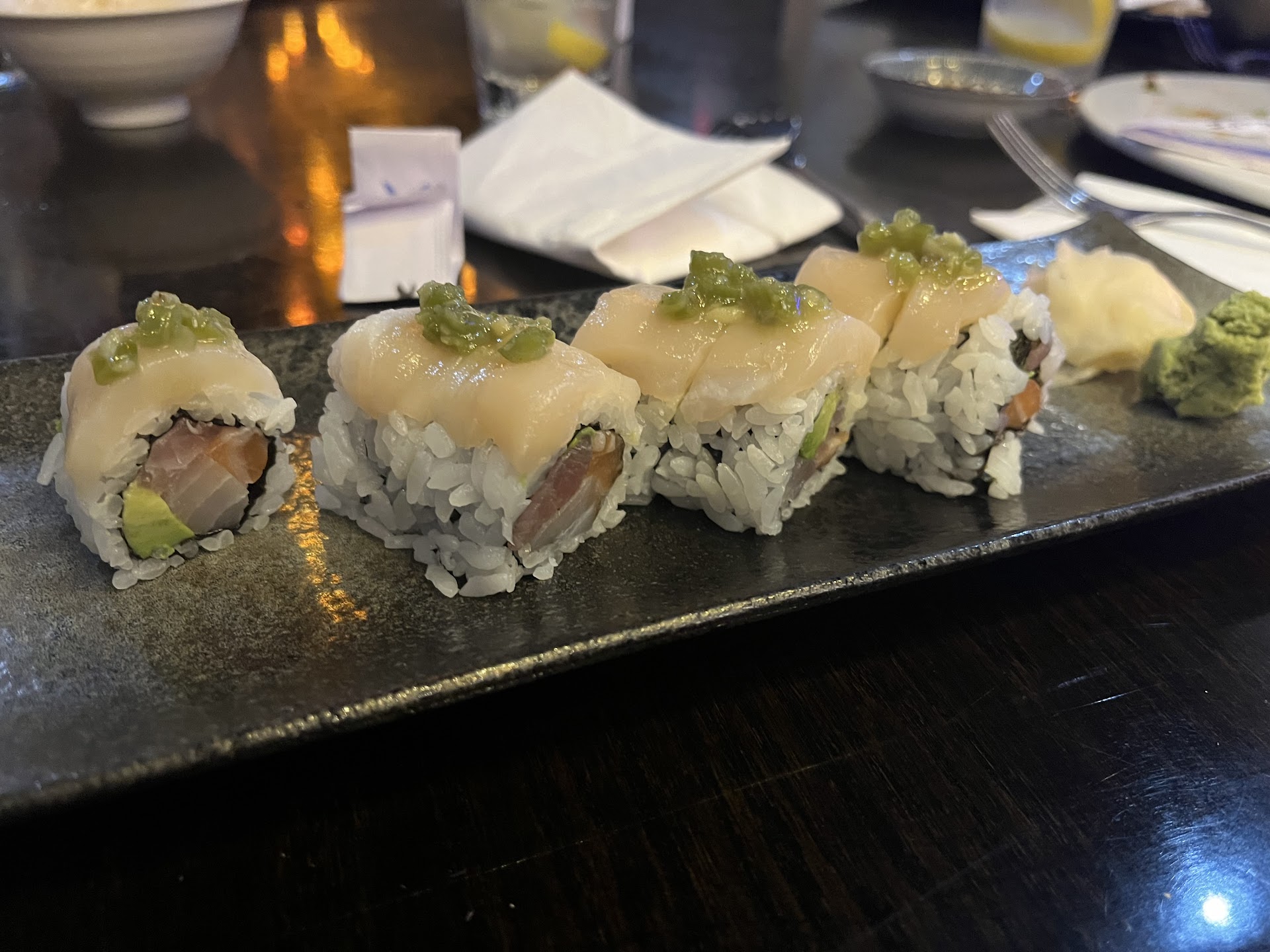 Read moreWent here with a group of 5 at 5:30pm for dinner. We were the first table seated and two more tables came later. The food didn’t come out until 6:30pm. Our waitress lost our order first and came back to ask again what everyone wanted. This was fine with us but the service was slow for not having many tables. Slow for water refills, placing our order, and we waited a long time before we could get the check. When the sushi finally came out, they forgot my order and served the rolls that did come out on the wrong plate (two separate orders mixed). I waited longer for my sushi and had to send it back. The sushi had a strong fishy taste and the top appeared to be slimy as shown in photo. By the time I got the food, we were there for over an hour, everyone was mostly done eating, and so I didn’t want to order another item. It seems like this place has a lot of takeout orders so it might not be the best for sit down. I wasn’t impressed with the quality of the seafood and our table agreed it wasn’t something we would...