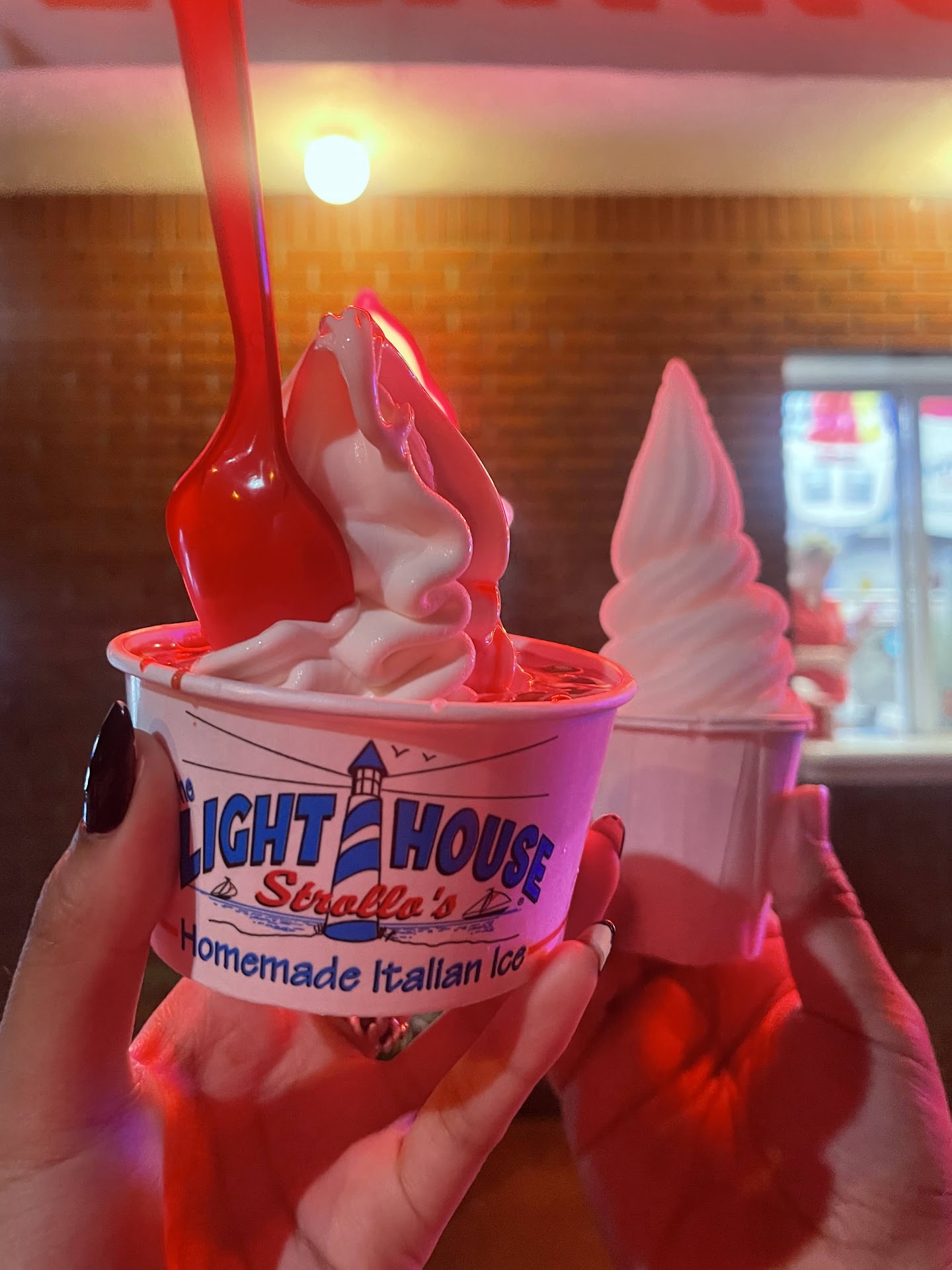 Okay ice cream and Italian ice, and if I'm being nice - okay service. One of the help tried to charge me $14 for a small sundae (which btw, this constitutes ice cream and hot fudge by their standards) and large ice cream with 1 topping (in dish), didn't even catch her own error until I balked, and then she told me it was $10, when I corrected her and said it's actually $9.50 (and this was her math W/a calculator). Anna's was by far better in both. Plus, she had a great menu. Lighthouse's menu is sparse, to...