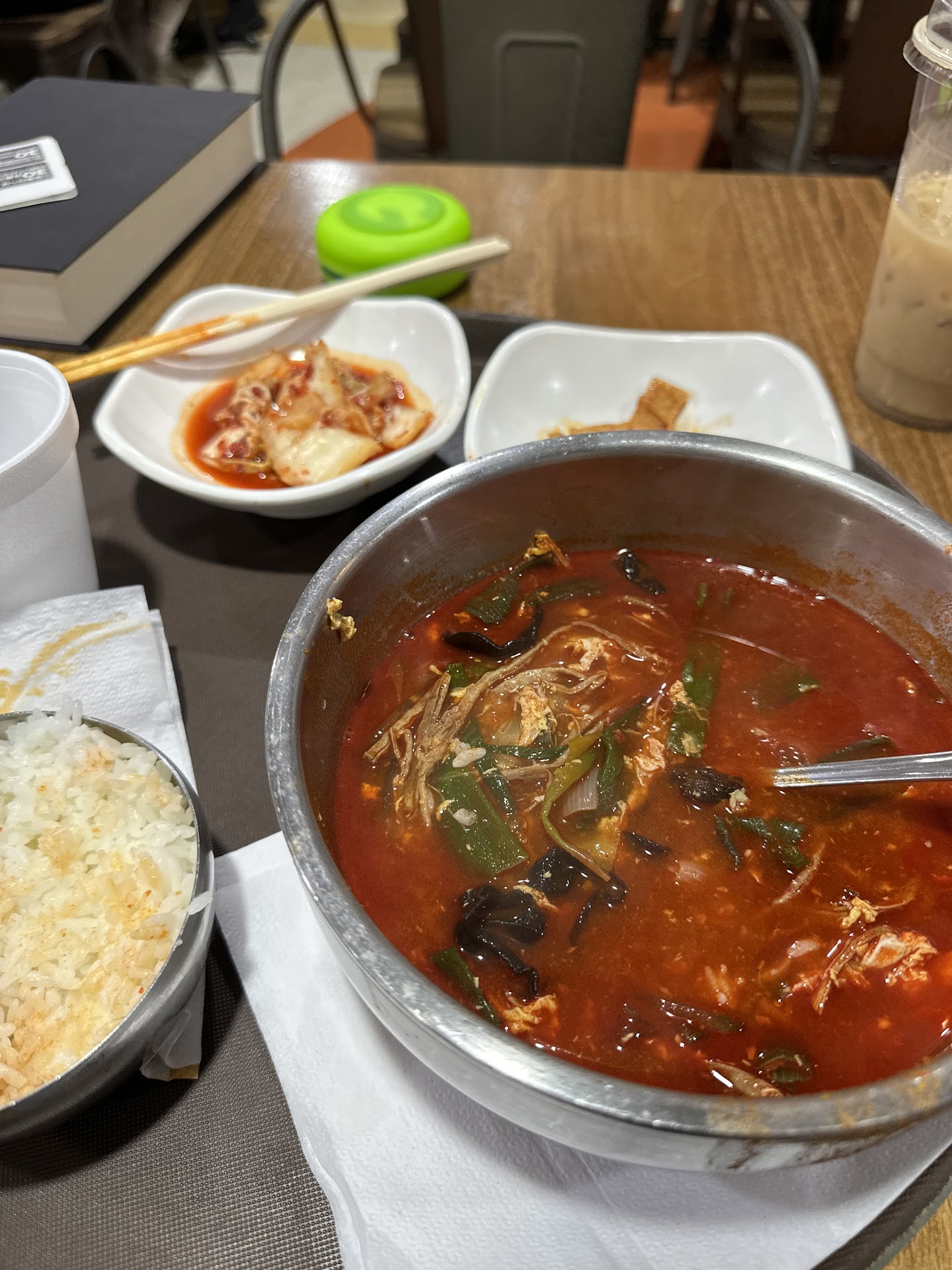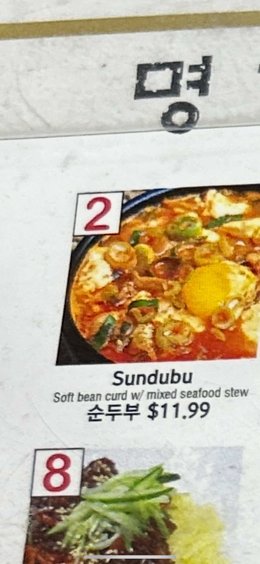 I love bibimbap. I suggested ordering this for one option for a first timer. #3 gopdol bibimbap (we were given a side of gochujang sauce). For our second option we choose #13 tray jjajing. Both were great options. The tray jjanjing had a tasty brown gravy on noodles with meat, octopus/squid(?), onions. It lists seafood, however the only bites I had were octopus/squid(?). The bibimbap had a great variety of vegetables. I have had bibimbap where the stone bowl crisps up the rice a bit more. Over all a solid choice when mixed with some gochujang sauce. As for the Banchan, I am usually pretty excited about these. The kimchi was spectacular. The pickle radish equally good. My only complaint is that we didn’t get two dishes of kimchi. Some tables seemed to have other options and double dishes of kimchi for two diners (maybe they asked?). I understand that they don’t have to pass out Banchan.