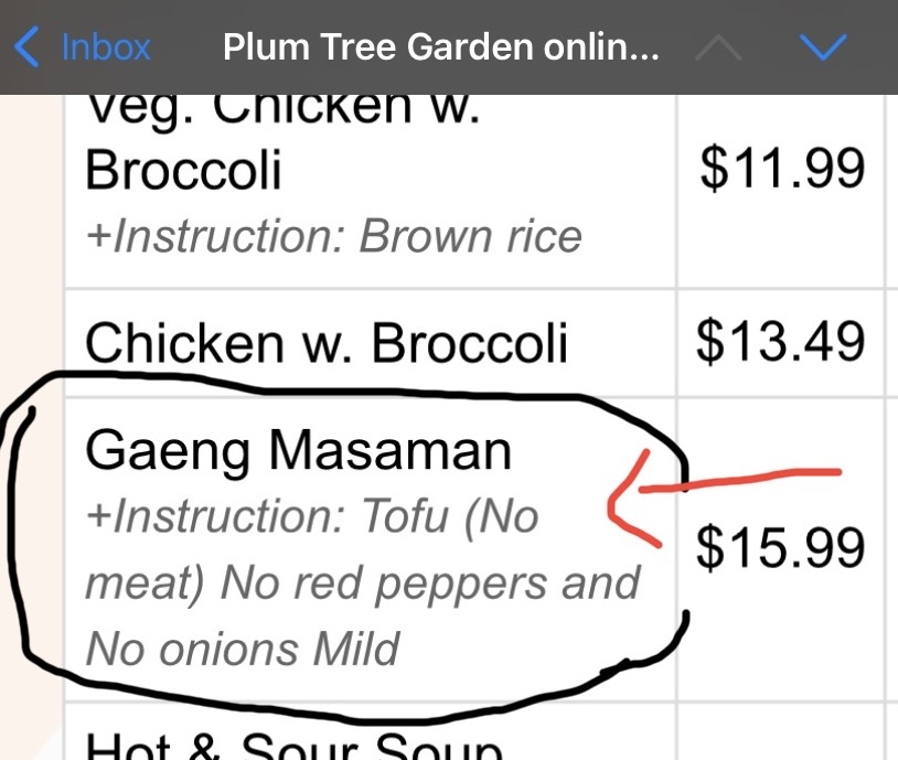 Read moreI had the worst experience with this restaurant. I am visiting my mom from out of state and my family ordered from them tonight on Christmas. I am vegan and ordered the masaman curry. There was no option to select tofu so I put tofu in the note and said no meat just to be safe. When the food arrived 3 hours later my dish had no tofu or veggies in it. It was just sauce with some diced potatoes for $16. That was it. Iâve had this dish 3x exactly as I ordered it in the past and it comes with green veggies and tofu when requested. The management refused to deliver my food again and only offered to refund my meal. I donât care about $16. I had no dinner with my family tonight. The manager was rude and gaslighted me by saying that they didnât include tofu because the word âaddâ wasnât before the word âtofuâ. I attached a screenshot. I will never return there and neither will my family or friends. I can find good food and kind service elsewhere. Good luck with your business when you treat...