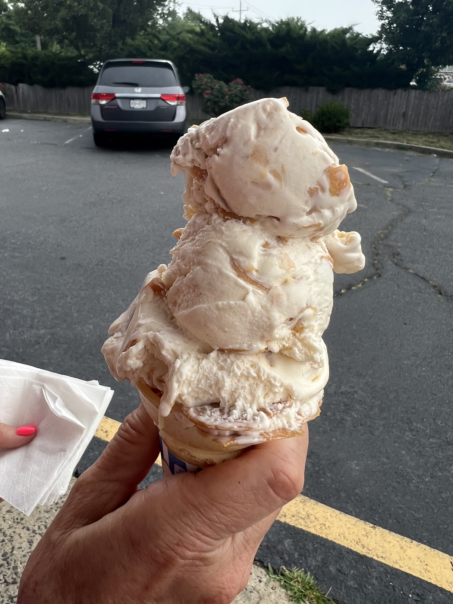 Huge portions, service takes a bit of a wait. The ‘hard’ ice cream (regular) is packed with pieces depending on the chosen flavor: good dark chocolate chips or pistachios or … Food color is used a lot, and so are artificial flavors and sugar. All is very sweet and rather has the taste of industrial ice cream. This is probably what one expects from a coastal ice cream store. We usually target more artisanal stores that use more fresh ingredients and more natural flavors, which is why I subtracted one star. But for those who anticipate and expect an American ice cream parlor, this is a good place to go. And the prices are very reasonable. There is some limited seating in the rear parking lot, but there are tons of mosquitos, so it won’t be much fun to have ice cream after the beach when the sun...