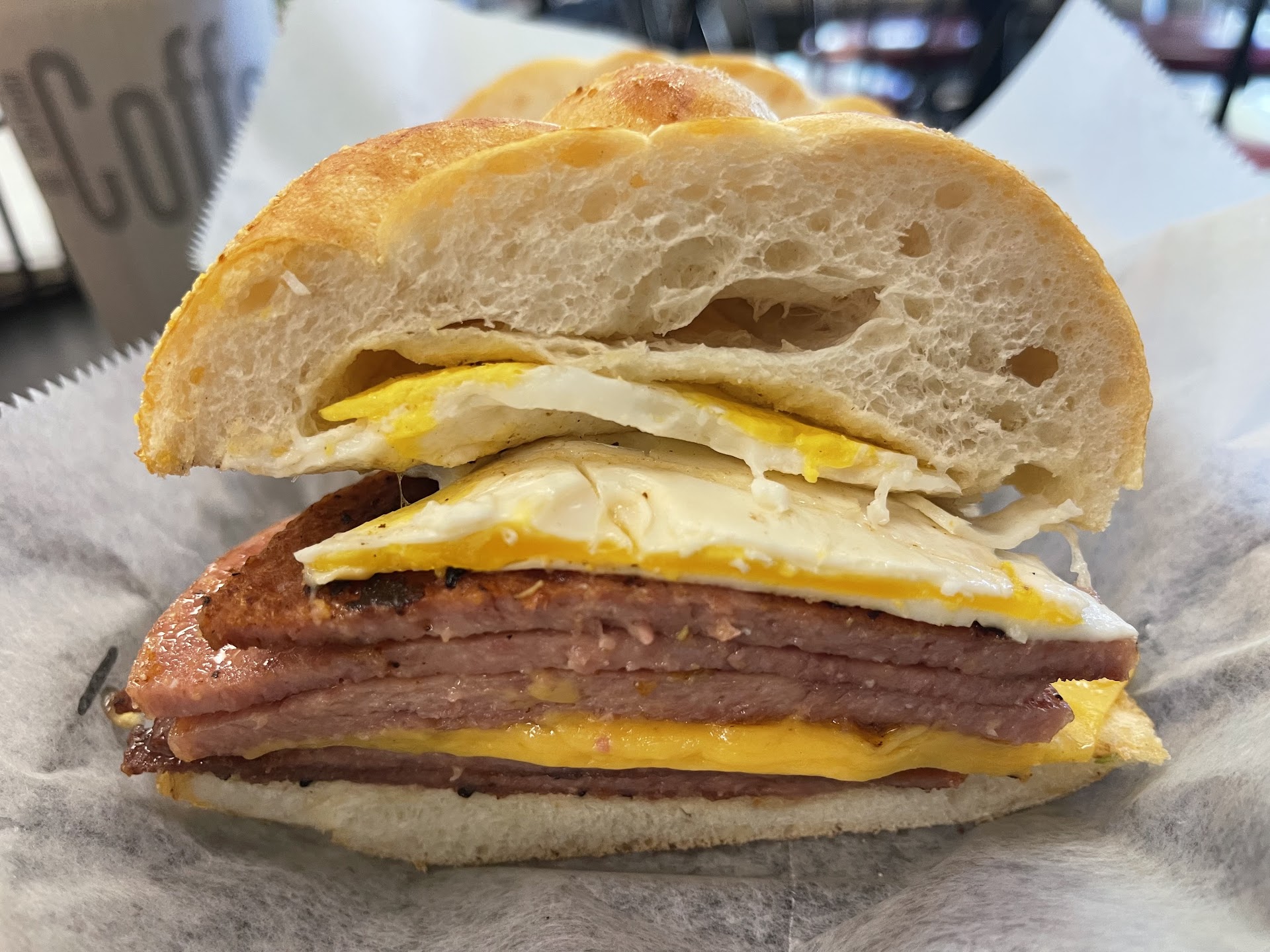 I wanted it as the Locals have it, S P K with Egg and Cheese Let me say, i could certainly get used to eating this every day! The flavors coming off the Ham, combined with the perfectly cooked egg and that melted cheese and fresh Bagel. Truly a delicious meal and it was gigantic! What an incredible idea! 💡 Makes me feel bad for the rest of the country that doesn't know what they're missing.