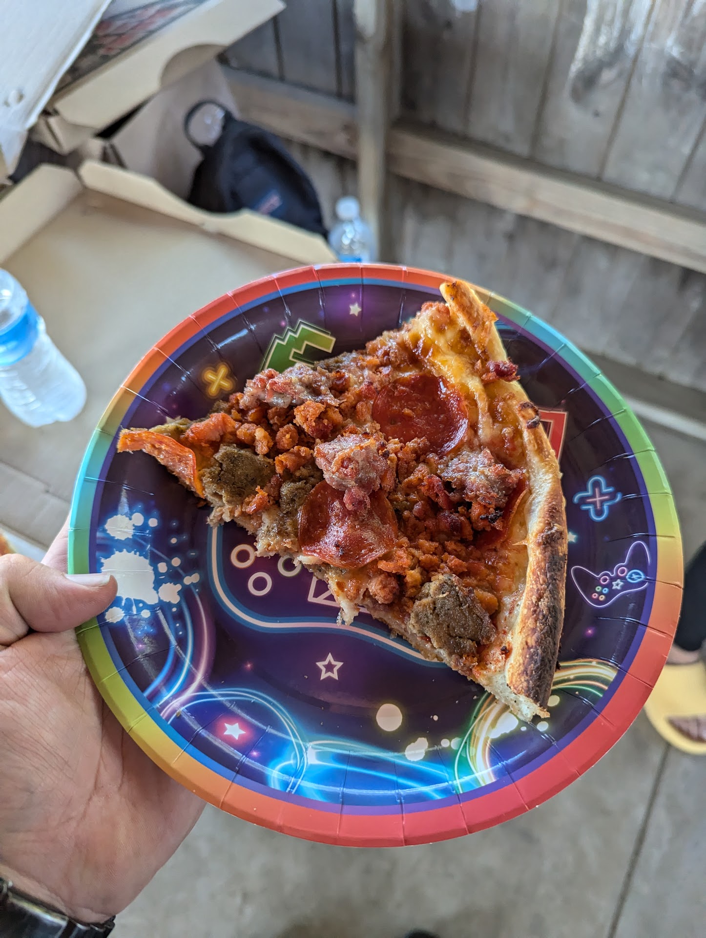 Read moreThe waitress was wonderful, had me laughing my head off when I asked her what the chalk drawing was about. She said the owner drew it, it was supposed to be Death holding Covid-19 in its hand. It was approaching a guy enjoying himself while tubing and drinking. If you think about it, it's hilarious. This guy is just sitting in his tube, floating, drinking, and along comes Death walking in the water up to his waist and approaches this guy, like "Hey, you there, having a good time? Well, not anymore!" I thought it was very, very funny. Anyway, she gave us a free beer when she figured out she had misunderstood our drink order. The menu lists two types of Sam Adams beers, but she insisted they only had one type. We didn't argue, but later on after she waited on another table who ordered the same thing, she realized what she had done and brought us the beer we'd wanted, explaining she'd had some brain fog or something. The vegetarian pizza was really, really good, but my pasta with oil and garlic was dry. Didn't have enough oil or garlic. But the garlic bread was very good, and the waitress even made sure to tell me it was made with oil and not butter, since I'm vegan and she had inquired ahead of time - good for her! You don't usually encounter such thoughtful and considerate waitstaff. We could have sat outside, but it was too windy for me, so we had a nice time watching the local news on the indoor tvs. All in all, a very nice time. I hope you get this great waitress when you're there, and get that tasty...