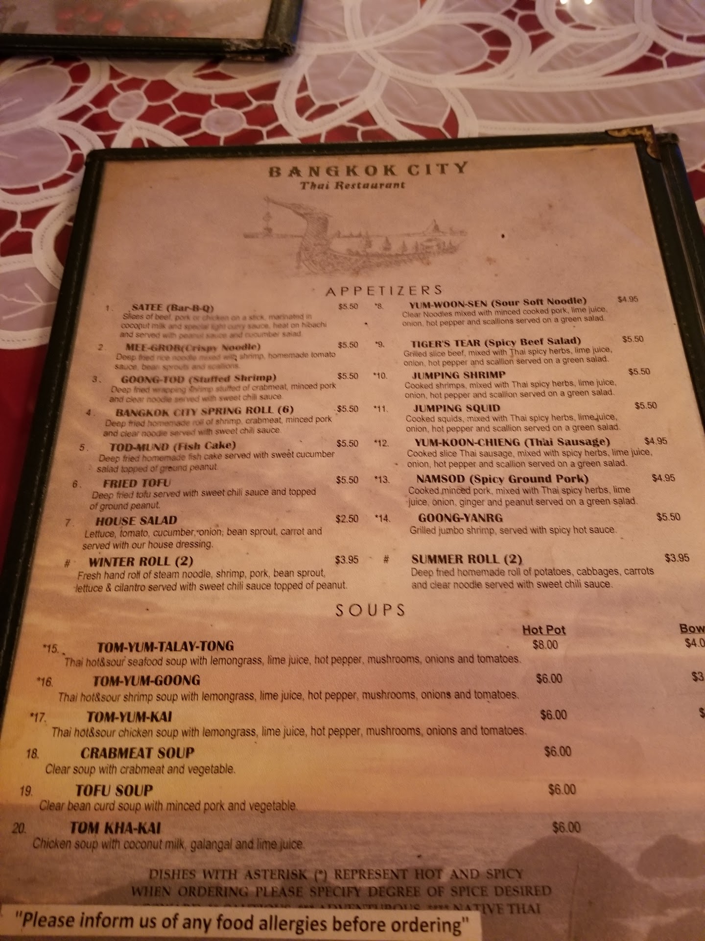 Read moreFood was not good, and the cheap price kind of matched the pricing. Of what we tried - tom yum soup was mainly water with salt and didn't have much. The noodle soup felt like mainly water too. The curry felt like a mixture of water and curry powder that's been on a shelf for while in a grocery store. Facility and feel looked like something from the 70s, that isn't kept up to date with the times. Menu's absence of any pictures and wording appears to be the same since at least 5 years ago, compared to other reviews. It was very dark inside, and the layout had a strange L shape. If you're looking for Thai food, the Siam square Thai restaurant is much better, just a 30 second...