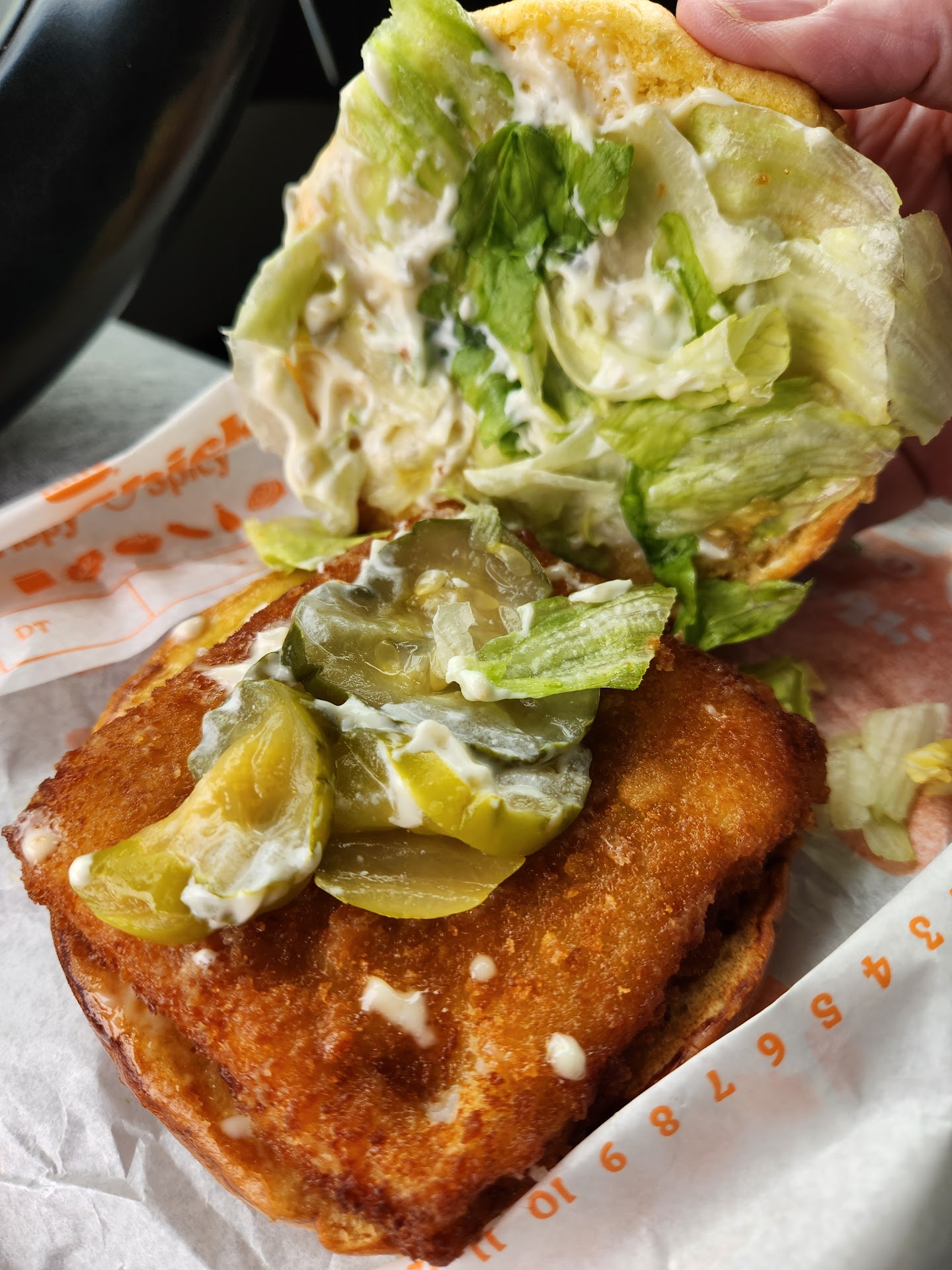 The sandwich was OK. Certainly, it's not anything truly remarkable. It was indeed fresh, though. At least the fish was. The bun was slightly stale, and I truly dislike the chopped lettuce they all want to use on sandwiches these days. A leaf would be so much tastier and tidier. Plenty of pickles. Maybe a few too many, but those can be taken off.