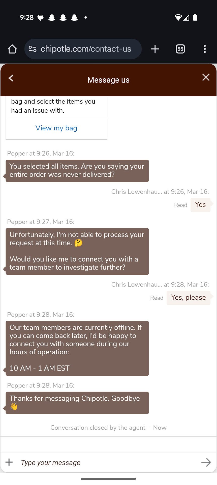 Update 2: It's the next day and I'm still trying to get my money back but Chipotle is telling me that no one can help me. Screen shot attached. Since I posted this review I've had multiple other people contact me saying they have had the same issue at this location. Do not order here! They will take all your money and never give you...