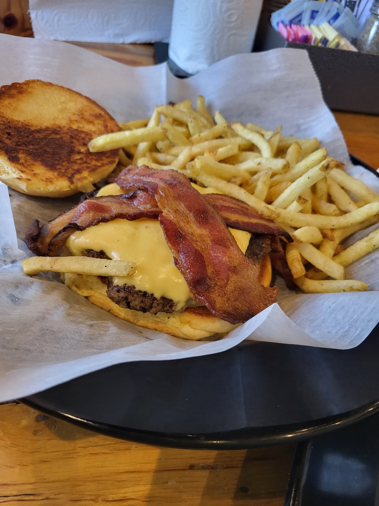 Unfortunately, our order was rung in as regular Bacon Cheeseburgers instead of BBQ Bacon Cheeseburgers. That meant the sandwiches came with lettuce, tomato, and mayonnaise. For my wife and daughter, it was a simple fix add BBQ sauce and enjoy. For me, that wasnāt possible because of the mayo.