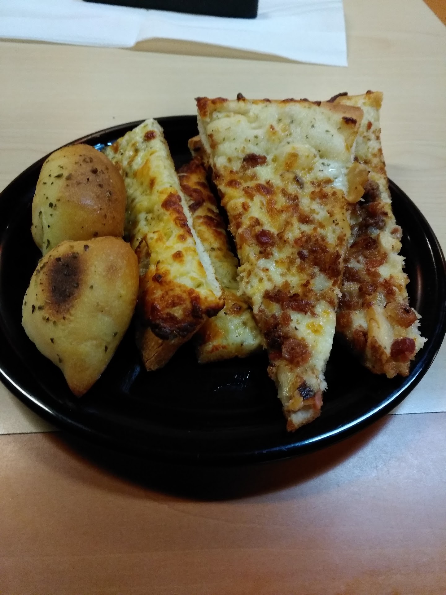 At least 7 pizzas on the buffet, all full or nearly full, plus cheese bread (a lot for few to no customers). How many hours old were they? 1, 2, since lunch? I don't know, but they certainly looked and tasted dried out and old. I should have asked for fresh pizza, but for my first time here, I wasn't certain what the standard was. As we were finishing, more people came in and fresh pizzas showed up. I tried a slice. Much improved and more cheese than the pizzas they replaced, which gave the appearance they cater to meal time crowds and slight those in-between.