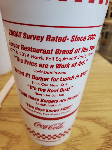 Read moreI'm new to Five Guys Restaurant. I will say the food here is worth the price. They give you plenty of food for what you pay for. It's all fresh from what I gathered. No preservatives or other stuff like that in the meat and the fries are cut on site after recieving it from a local farm somewhere in the country or locally(Not Frozen). You won't leave here hungry! Me my wife and three kids with different kinds of Burgers/BLTs,Grilled Cheese, large fries and 5 drinks were $50.02. Oh and the large fries we ordered were plenty enough to feed all 5 of us and had some leftovers. Part of the fries come in a brown paper bag then inside the brown paper bag there will be a large cup of fries. They have the Coke dispensers that have the different flavors and the condiments were in pumps you add into a small cup. It was a great experience and the food was like eating a grilled burger at home. I will.be returning to Five Guys in the near future. I just can't go without my wife and kids or they will be upset that they didn't get to eat there. If your considering it. Just go eat here. You...