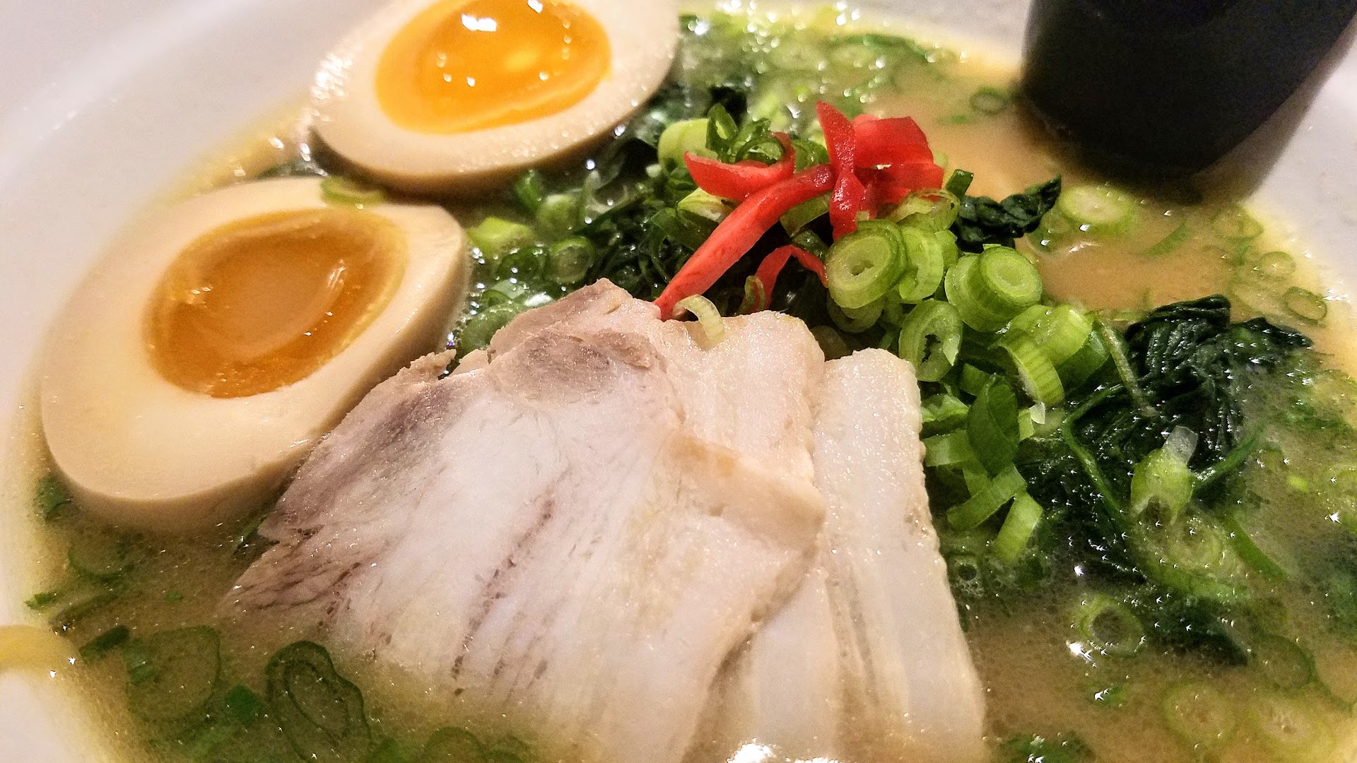 Read moreSaw this place featured in a YouTube video hosted by daym drops. Had high hopes for it. When my son told me dad I want ramen for my birthday dinner, I said you know what how about this place. I showed him the video and he said looks good let's go. So we get there around 7:30 p.m the place wasn't really busy there was like 4 groups there. It was dark inside I guess setting the mood. But you cut see the menu. They only had 1 waiter who seem to be new and the lady who was running the place was yelling at him the whole time we were there. I ordered the sweet buns which honestly was the best thing we had. Crispy outer shell pillowy soft interior. We both ordered the spicy miso ramen. Now I'm now ramen expert but the lack of spice in the spicy miso ramen was ridiculous. I've had more spicy from a bag of chips to be honest. Also I ordered a brown sugar milk tea before ordering my appetizers and didn't get it until I was half way done with my meal and thats because I asked the dude " hey listen o know you seem to be a little overwhelmed but I never got my milk tea. The thing that made me come to the conclusion that I will never return was the fact that 1 of the appetizers that I ordered was brought to the wrong table and honestly I do t know how long it was there but I look over and I see waiter take the food from that customer put it with my other appetizer and bring it to my table. If it wasn't for my son enjoying g his experience he's been dieing to try, I would have left. But the waiter was trying his best so I left his a $15...