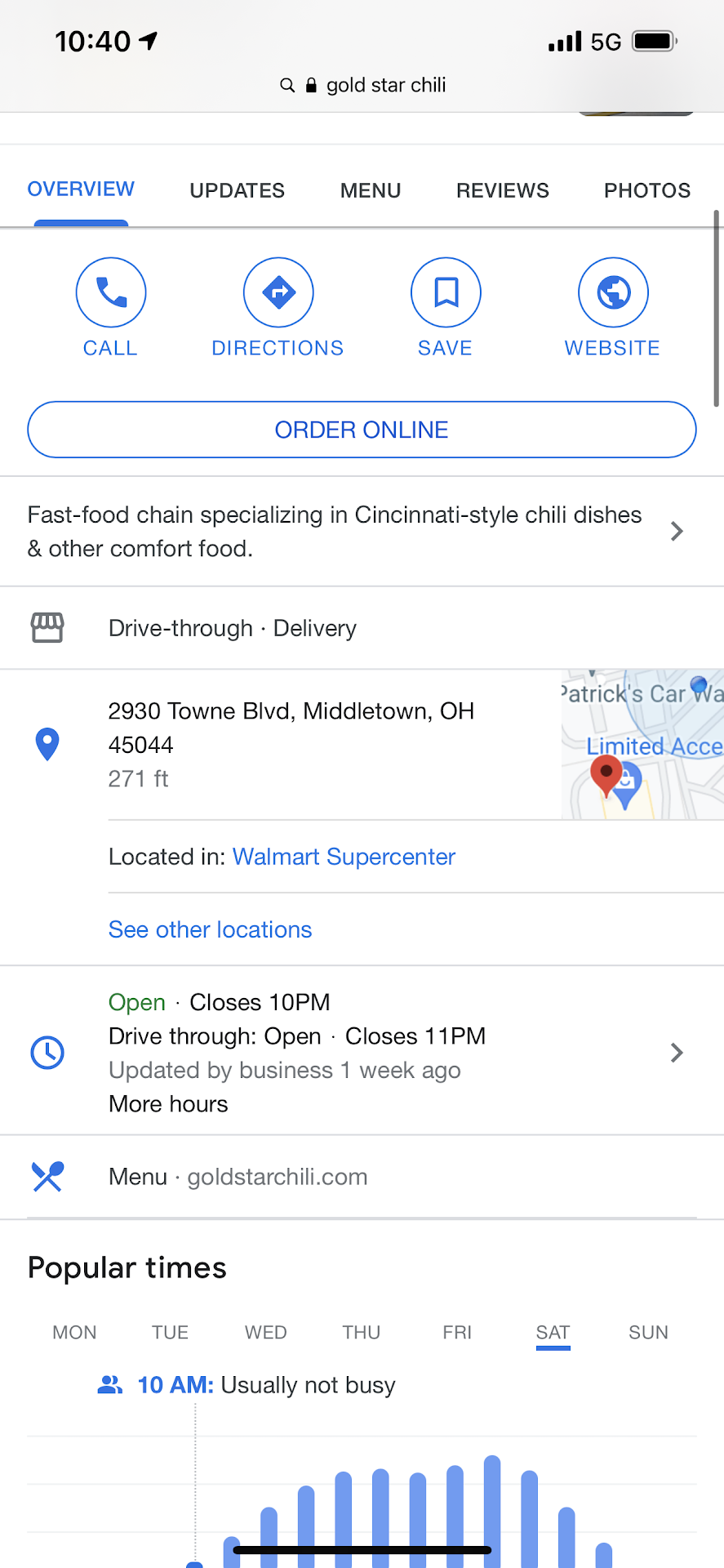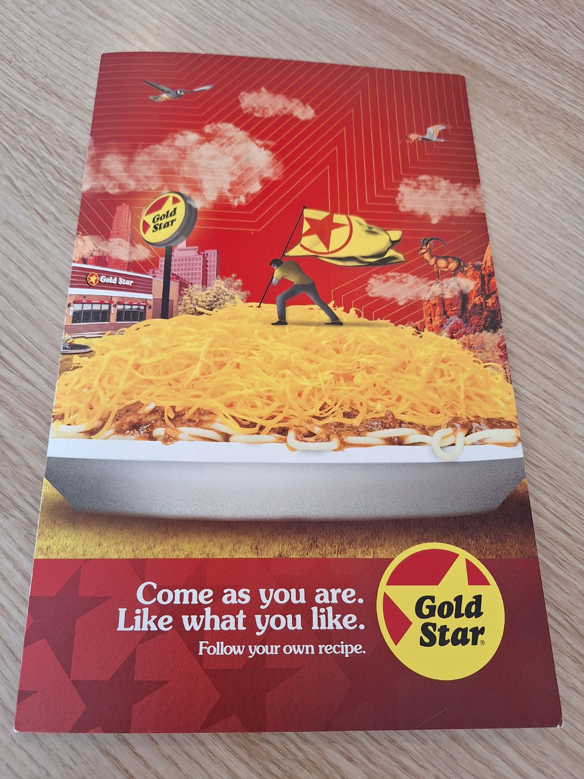 Gold Star Chili had me curious as I look at it from across the street from the hotel we were staying at and one day i finally got the courage to go and taste the food and I was a little thrown back by what makes this an experience. The young staff were very nice and courteous and very respectful they took my order and a no time I got my food. My fault I didnt inspect the food that I got and saw they messed up the order. As I ate the food I noticed that they were very chilly oriented. the chili had a taste that I'm not used to but it wasn't bad. Im from the East Coast so I expect chili to be more Saucy more spicy so it was a different texture and consistency that sweet ive never had with chili before. Im more of a chuck chili guy then saucy if u get what i mean