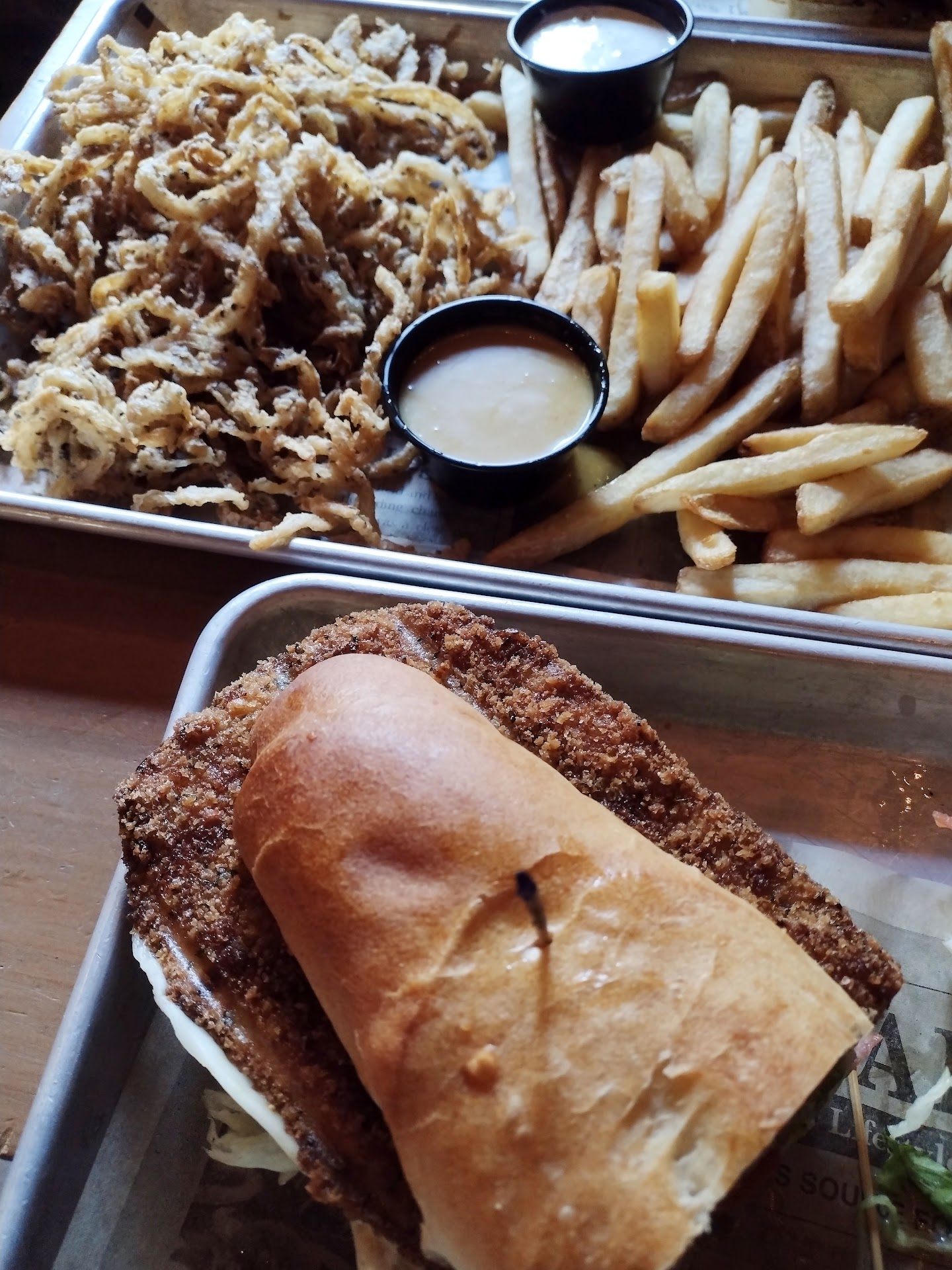 I went with the Maple Chicken sandwich, minus the arugula and onions. It was fine; I always like the extra effort of the pulled chicken on a sandwich like this, which was probably my favorite aspect. I think it really needed some kind of condiment because it was definitely on the dry side - the maple bacon jam didn't really do anything in the moist department, and as a personal texture-based palate preference, I wasn't crazy about the random crunch of a bacon bit in there. The maple definitely paired well with the chicken though, and the flavoring was solid.