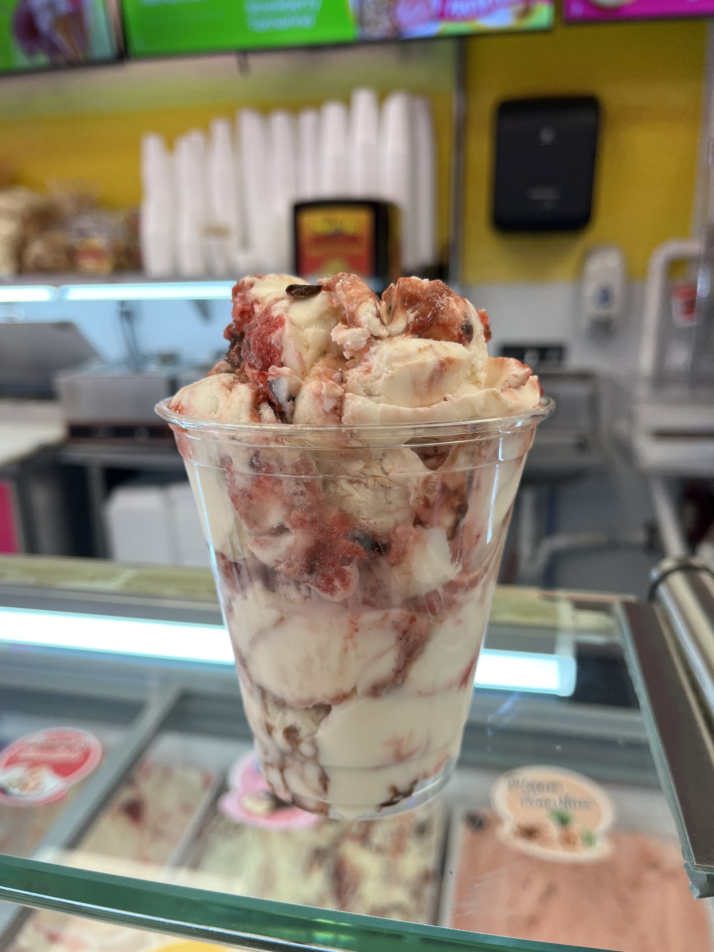 Read morePromised my daughter late night ice cream we walked in about 15-30 minutes before they closed. They were cleaning up but everyone was so nice about it. They have so many options but wanted to keep it simple so they could close up. My daughter got a huge scoop of Oreo on a cone and I got a small cup of Strawberry Cheesecake for under $7. The price I thought was great for the generous amount of ice cream we got. I couldn't tell what a lot of their menu meant but I'm hoping to visit again one day and have staff help me pick out something more interesting to try....