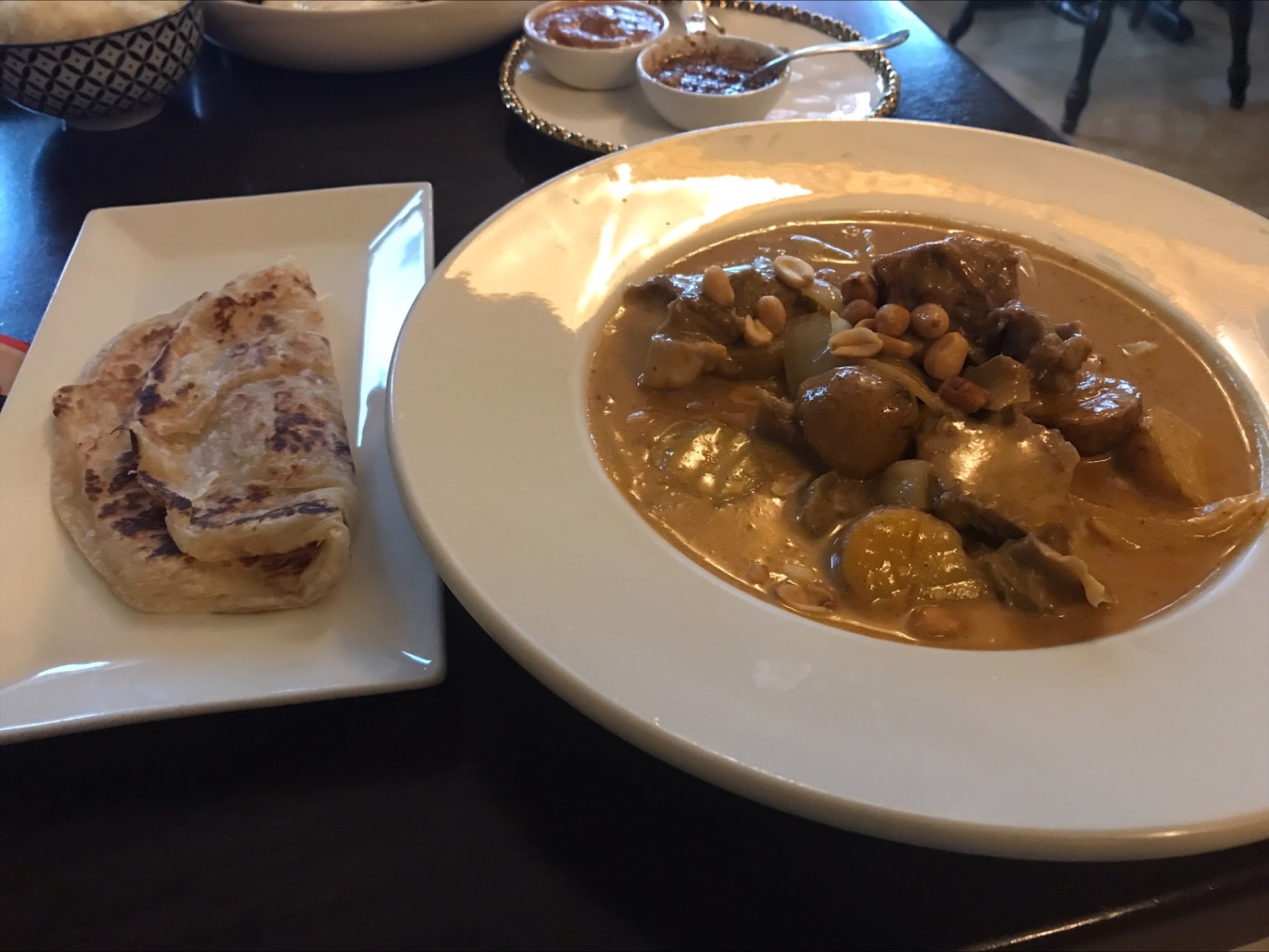 We ordered the chive pancakes to share and it was crispy and delicious! The Tom yum soup had the perfect balance between spicy and tart, which paired nicely with white rice. My mom ordered her favorite dish, pad Thai, and devoured the whole plate. My husband ordered the NaPha Thai wrap thinking he was going to eat three wraps, but the dish was a jumbo build-your-own platter and it was definitely more than just three wraps! The ingredients were nicely chopped and plated for ease of assembly. He was a stuffed happy camper by the end of his meal. As for me, I ordered KaoSoi (chicken) because I haven’t seen that on a menu before, so I decided to try something new. My meal came with two types of noodles, one that was boiled and soaked in with the broth and the fried noodle that served as an eye-catching decor became a tasty and crunchy second meal. The chicken was juicy and...