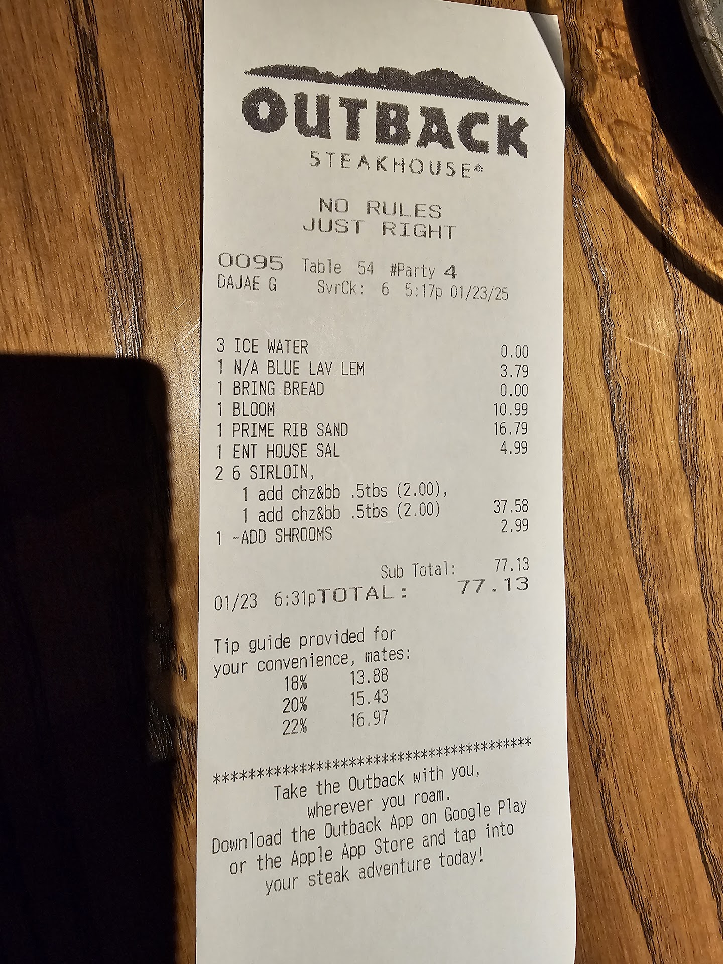 Wasn’t even gonna say anything, but after the “Owner did Nothing “ I’ll state my piece n 200$ meal we order twice a week we’ll continue to go to Dover location “ Was pretty patient after waiting to get seated with a call ahead for almost n hour Then we sit down and order our entire meal as soon as we sat down and 45 mins later we got our drinks n forgot my tea waited another 10 mins for my drink blooming onion n coco shirk came out Blooming onion burnt on the ends n raw inside They took it back tried to remake, 10 mins later manager brought another one out n was completely raw inside n barely cooked on outside, ok no problem My problem is the manager asked how everything else was I said it’s been over an hour and still had no salads or bread as we’re watching tables all around us get drinks, bread, apps n food great service n the guy I thought was a store manager who I later found out was the owner had visited all the tables around us n then was chatting it up at the bar with a couple of women sitting at the end by thereself, too busy ti come over to us The manager never came back to talk to us n went on to another table n then our salads finally came out with No dressing none at this point was almost n 1-hour and 30 mins I had enough, wife n kids had enough, instead of walking out the wife n kids went to roadhouse I told the gentleman at the end of the bar n he said sorry for the missed opportunity n they had 85 5 star reviews, Was actually 55 most people like me don’t like to complain He used the excuse that they were tryna work out there kinks I told him chili’s was the best experience we ever had with a new restaurant opening n how patient we were n I asked him if he was the store manager N he said No I’m The Owner and did nothing , offered nothing n quite honestly could care less It’s outback the food sells itself he’s not worried I’m sure Consumer be ware Proceed with caution Oh yea n my wife is throwing up from the raw shrimp coco shrimp n...