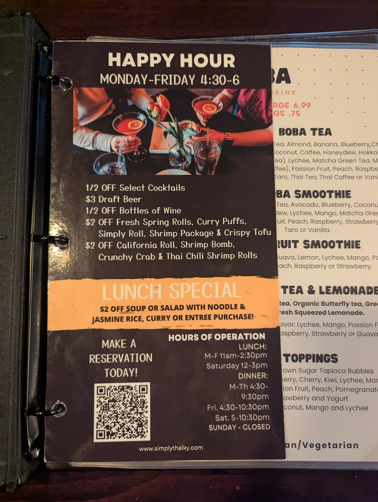 This location was easy to get too, easy to park, and the restaurant is nice and clean with a fun tropical theme to it. The staff were young, but courteous, timely and attentive. My wife has actually visited Thailand twice, and she was impressed with the menu selection and authenticity of our dishes taste and her sweet peach boba tea that she had. Which although the large tea was $7, it was VERY good, and I’ve had many a southern sweet tea too. She said that it reminded her of the tea in Thailand, some of the best she’s ever had! And we travel a lot.