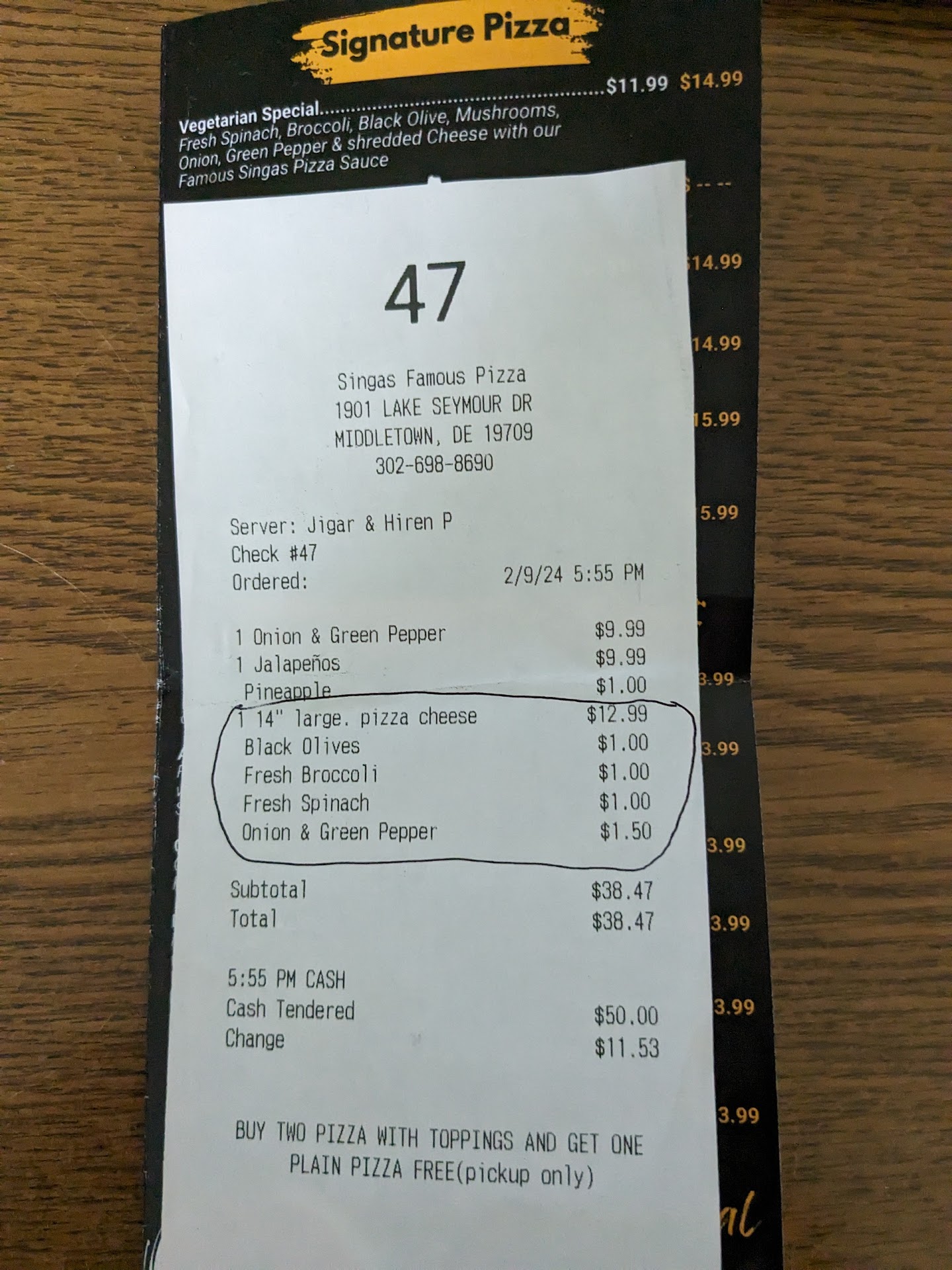 Read morePetty & Pathetic - We have had Singa's Pizza at other outlets in NJ before and this outlet opened recently so we were eager to try for a family dinner. Looked at the menu that was placed on the ordering counter, and among other things ordered a large vegetarian special listed for 14.99. The person who took the order used a highly unethical way of charging for it. He used a base large cheese pizza and then charged for each ingredient individually instead of entering the vegetarian special listed on the menu. He charged us almost 3 bucks more than the listed menu price. This is the petty part. The pathetic part is when the unusual and erroneous charge was highlighted, he said the menu was old and prices were updated. For an outlet that opened recently, the menu prices are old is a pathetic excuse. If the prices are old then please provide the correct updated menus. Such unethical business practices won't get our...