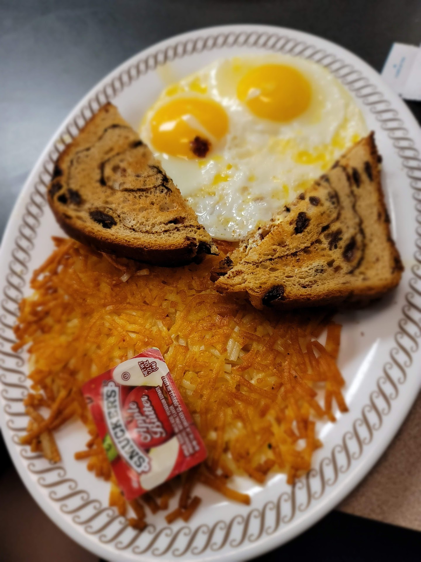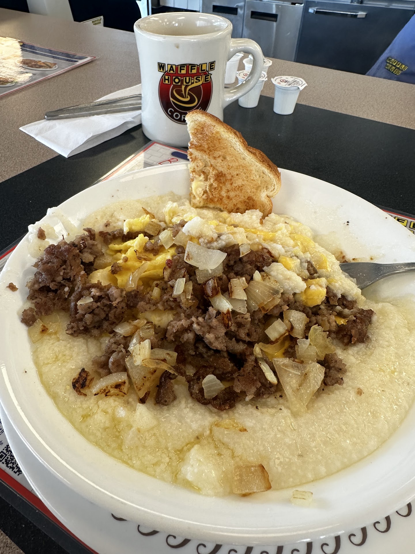 Read moreThis is the waffle house across from Walmart. In shelbyville.Ky. .....Very disappointed. ... Many empty tables but all were full of dirty dishes.. many staff just standing around. N stared at us as though we were creatures from outer space... when they did Clean it off they took a rag from a pan got dripping water all over the clean steak knives above.. wiped the table throwing all the excess n crumbs on the floor. . The waiter was friendly and attentive. Took our orders.. I ordered the chicken melt hashbrowns bowl with 2 over easy eggs n a side of gravy. My hubby ordered the patty melt hashbrowns bowl.. his order came first but it wasn't a bowl it was a patty melt on toast with hashbrowns on the side..he doesn't like to complain so ate it.. my chicken melt came the eggs were over hard while chopping my eggs into my bowl I found 2 different pieces of plastic under the eggs. I told the waiter he in turn told the manager n they did comp my meal n remade my order.. meanwhile another waitress was mopping the floor. Left bits of food along the sides from not moving the chairs out of the way.. others were stacking dishes very loudly.. if I treated my dishes that way I'd have broken or chipped ones.. really un professional.. we eat at waffle house when we travel as we have come to expect a clean establishment n good food n waitstaff.. like I said the waiter was friendly n did his job n got his tip. but others didn't n that weighs heavy when one expects better.. the manager needs to take a good look at her staff.n how they clean n treat things. and the appearance of...