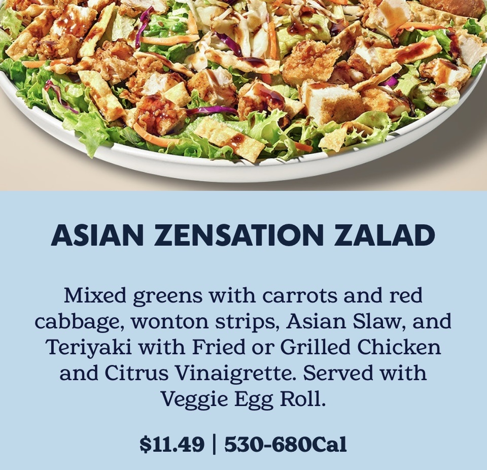 Philip Parrino and I went to Zaxby’s at 807 Blankenbaker Pkwy tonight. We are members of the Zax’s Rewardz Group. We used our mobile app to see how many points we had and if they had any specials. We decided to use our $5.00 reward. We placed our online order and drove straight to Zaxby’s and went into the restaurant. Our order was ready and we had already paid online for it. We ordered Phil the Asian Zen Zalad. The zalad comes with mixed greens, carrots and red cabbage, wonton strips and Asian slaw and Teriyaki with fried or grilled chicken with Citrus Vinaigrette. It is served with a veggie egg roll. It is so tasty. I took a small portion of Phil’s salad and ate it with my chicken fingers. Everything was so good and fresh and delicious. Elizabeth came out from behind the counter and checked on us several times. We finished eating and refilled our ice teas and said our good byes to Elizabeth. It was about closing time so of course it was quiet and we enjoyed being out together. We added our points back on our rewards account and then headed for home. All in less than 30...