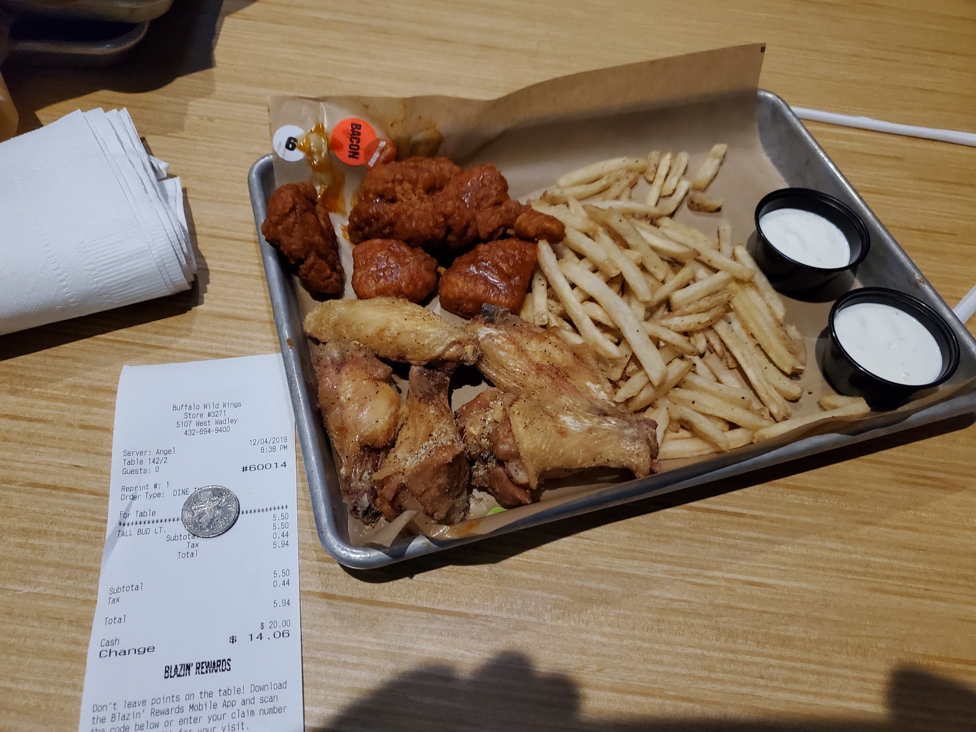Ā Ā Ā Read moreIām currently sitting at this Buffalo Wild Wings trying to enjoy a meal, first of all I donāt come to Bdubs bc we always have a crappy experience. But being in a new state 14 hours away from where we moved we figured we would give it a try, and I was craving fried pickles.. they came out clumped and I understand sometimes it happens. Iāve worked in the restaurant industry both FOH and BOH. But when you have two clumps of 3-5 pieces each thereās an issue, change your batter! I am not paying $9 for a bunch of clumped pickles. I was tempted to eat them bc of how bad I wanted them but realized I didnāt want raw batter in my mouth. Cheese curds $11 for 8 pieces of small burnt cheese? šš then after a while our wings came out, if Iām paying $25 for 20 wings you better have those fresh. My buffalo was so old we couldnāt even tear the meat from the bones, thankfully the other two flavors seemed to have come out fresh but what a waste of 10 wings there goes $12.50. You can clearly see the fresh vs the nonfresh ones. The drinks are flat, they may need to check their carbonation tank in the back. If youāre going to charge $4 for a soda you might wanna make sure itās not flat. My sonās food was cold, how embarrassing giving a 2 year old cold food he eats everything yet he wouldnāt touch their food.