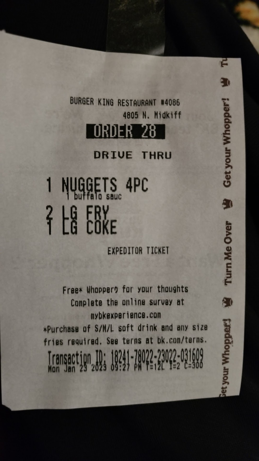 By far the WORST fast food establishment in Midland. The first time we went, it was my brother and I. There was no one in line at the drive through and the restaurant itself looked like it wasn’t busy at all. We pulled up and it took five minutes for them to tell us “give me a minute” very rudely. We waited another 5 minutes and said “hello” and we were answered back with a very rude “I said one minute”. After waiting nearly 20 minutes, no exaggeration, the woman took our order. We asked for the chicken strips, only strips, no meal, and they entered in spicy nuggets. We had to tell them 4 times to correct it. Then when I told them a whopper with cheese and no mustard I was told “we don’t do it like that” I replied with an excuse me and she replied with a “do you want the whopper or not?”. At that point we left and went to another burger king who served us well. Episode 2: me and my family went last night (figured night shift would serve us better) It took them yet again another 10 to 15 minutes to take our order with the restaurant not being busy again. We asked for 3 number one meals with cheese, large with sprites. We also asked for 2 number fours, large with sprite and Dr Pepper. We pulled forward only to wait for 20 minutes for the cook to finally come tell us that he didn’t know where the drive through person went and he couldn’t take our money because he didn’t know how to pull everything up. After 5 more minutes of waiting we watched what looked to be a manager get out of her suv (looked like she had been smoking) and came in and went to the window. Laughing about the fact we were waiting like it was some joke she said my bad and gave us out bags and drinks. I asked her for corporates number and she didn’t look very happy. She replied it’s on the receipt. We left and went home to find we weren’t given one of the number four meals, just the drink and one of our whoppers was gone as well. I called to complain and no one picked up. I was left a voice message from the “GM” this morning to call her back. I called and got no response yet again. This place is horrible with customer service. The food we were given was cold and hard. It doesn’t seem like anyone in that establishment takes their job seriously. I’m very disappointed to see such a place with a reputation for great fast food be brought so low by careless employees with bad attitudes and poor customer service skills. Me and my family and friends won’t be eating there again and we are making sure to let anyone we are aquatinted with know to stay clear of the...