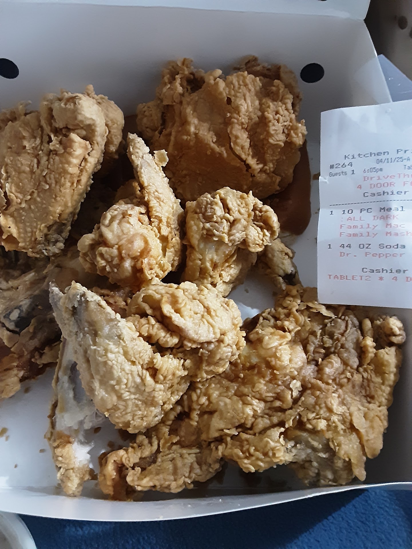 Read moreI stopped earlier this week to pick up a 10 piece family meal. 29.00 and change. I admit chicken was delicious and fresh tasting but dang the price was way off scale. I guess I haven't eat chicken in a long time and forgot that I use to deliver chicken to restaurants. Never seen prices so high.Service was great and speed of order. Only complaint is the cashier took my money and grabbed a box to fill up with chicken without washing hands or putting on gloves. I almost told him to refund my money but I...