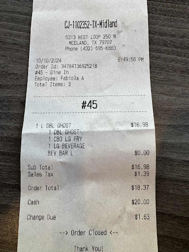 I believe Fabiola is a manager who was taking our order at the register. When my husband asked a question about the new fries that were supposed to be hot she was short and rude. Spoke to us as if we were ignorant. Just because she is bilingual doesn't make her superior. She tried acting as if she didn't understand us when I asked her about why our order was so much for 3 meals. Over $50.00. We paid. When I looked at the receipt I did notice that she over charged for my husband's meal. She refunded it and started over. The meal became $13 dollars LESS than we were originally charged. Once I sat down and continued looking at the original receipt, I noticed that Fabiola had also over charged for my meal. I very specifically asked for the Western Bacon cheeseburger meal with onion rings. Large. She charged for the double western. That is not what I ordered. So after she wanted to debate how I ordered, she told me it was too late, it's already made. A gentleman came over. He was wearing a manager shirt like Fabiola. He said he would give me the difference. I informed him it's not even about the difference in the cost, she was charging people for MORE than they ordered. It's dishonest for one. He gave my husband $2. I'm sure the difference is more but at this point it's the principal. Not about the cost. The male manager informed my husband that the cost of everything has gone up. After my husband mentioned that for what she charged us, we could have gone to a sit down restaurant, he let us know that when her and him go to Five Guys, it is $50. Now I am assuming at this point that they are a couple and that is why he is defending her every wrong doing. If anyone who knows me is asked the question, where is your mom's favorite fast food place, they will tell them "Carl's Jr" We drove 2 hours to eat here. Received service that any store manager should be ashamed of. Absolutely ridiculous. My husband brought home Carl's Jr a few weeks ago when he had training in Odessa. He went thru the drive through and was also given the wrong orders, charged him over $50 that time too. I figured it was a misunderstanding. Apparently this is how they are running this establishment. They should be ashamed of themselves. Ripping people off and treating them as if we were an inconvenience because SHE charged us for the incorrect items.