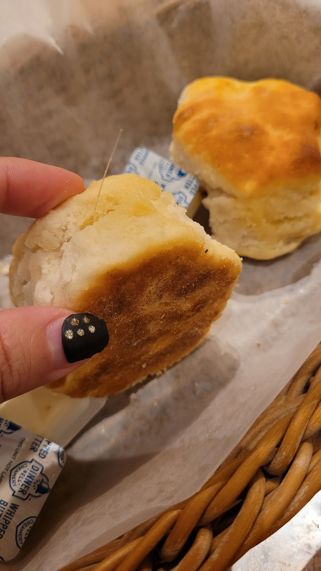 I also tried the Grandma’s Sampler, and it was everything I could have hoped for: fluffy pancakes, savory sausage, thick-cut bacon, perfectly cooked eggs, and a little serving of ham that was packed with flavor. It’s the perfect dish when you want a little taste of everything that makes breakfast great. And of course, no visit would be complete without Cracker Barrel’s legendary biscuits — soft, buttery, and so good they practically melt in your mouth. They tasted freshly made and paired perfectly with the warm apple butter and jam on the table.